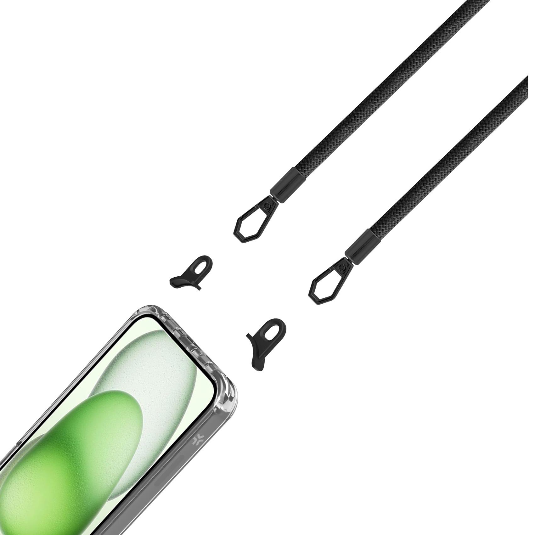 Cover FREEDOM con fori dedicati per i ganci e un laccio nero con ganci in metallo e ganci removibili da applicare alla cover dedicata.