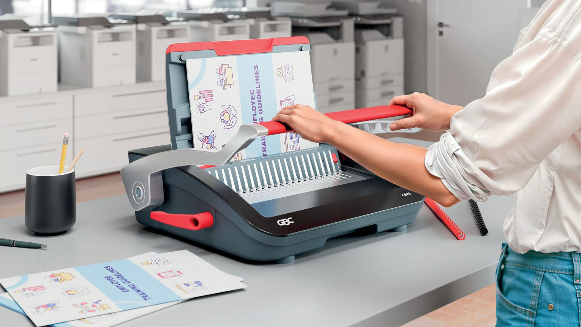 Descrizione dettagliataGBC Rilegatrice CombBind® CB25Rilegatrice manuale a dorsi ad anelli, affidabile e compatta, ideale per uso condiviso in uffici e ambienti scolastici con esigenze di volume medio.Perfora fino a 25 fogli di carta da 80 g/m² in un’unica operazione.Capacità di rilegatura: fino a 390 fogli alla volta con dorsi da 45 mm.Design leggero e salvaspazio, perfetto per l’uso ovunque e facile da riporre quando non utilizzata.Dotata di vassoio per i ritagli, che consente uno smaltimento facile e ordinato.Include un vano portaoggetti pratico, per avere sempre a disposizione i materiali necessari.Colore: nero e argento, per uno stile elegante e professionale.