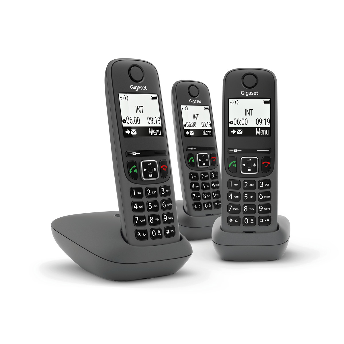 Gigaset AS490 Trio. Tipo: Telefono analogico/DECT, Tipo di apparecchio: Cornetta wireless. Telefono con vivavoce. Raggio d'azione interno: 50 m, Raggio d'azione esterno: 300 m. Capacità rubrica: 100 voci. Identificatore di chiamata. Dimensioni diagonale schermo: 5,08 cm (2"). Colore del prodotto: Nero. Numero di cornette incluse: 3
