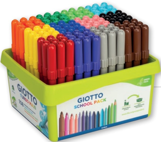 Giotto Turbo Maxi. Numero di colori: 9 colori, Colore penna: Nero, Blu, Marrone, Verde, Grigio, Azzurro, Arancione, Rosa, Rosso, Viola, Giallo, Tipo di punta: Tipo di punta. Larghezza imballo: 405 mm, Profondità imballo: 325 mm, Altezza imballo: 235 mm. Quantità per pacco: 108 pz, Tipo di imballo: Scatola di plastica