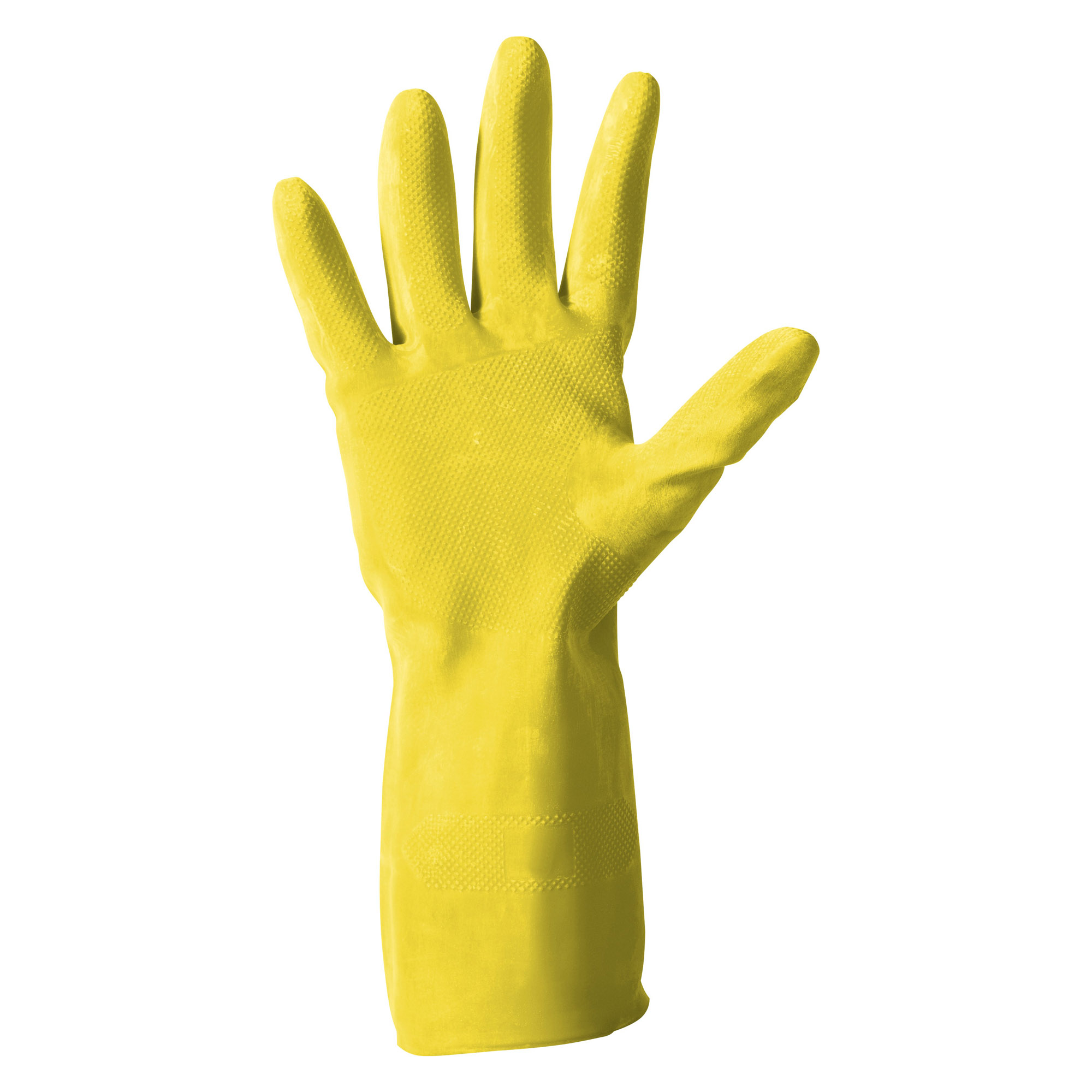Guanto industriale in lattice giallo con bordino salvagoccia, finitura antiscivolo su palmo e dita e floccatura interna in cotone.