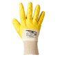 Guanto in cotone jersey colore beige, spalmatura su palmo e dorso fino alle nocche in materiale polimerico (NBR pesante) colore giallo e polsino elasticizzato beige. Con la spalmatura in nitrile leggero su supporto jersey di cotone proteggono da oli, idrocarburi ed agenti chimici, non permettendo a questi di entrare a contatto con la mano