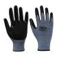 Guanto in filo continuo (13g), palmo ricoperto di nitrile liscio, resistente al taglio, repellente, polso elasticizzato e dorso areato, buona destrezza.
