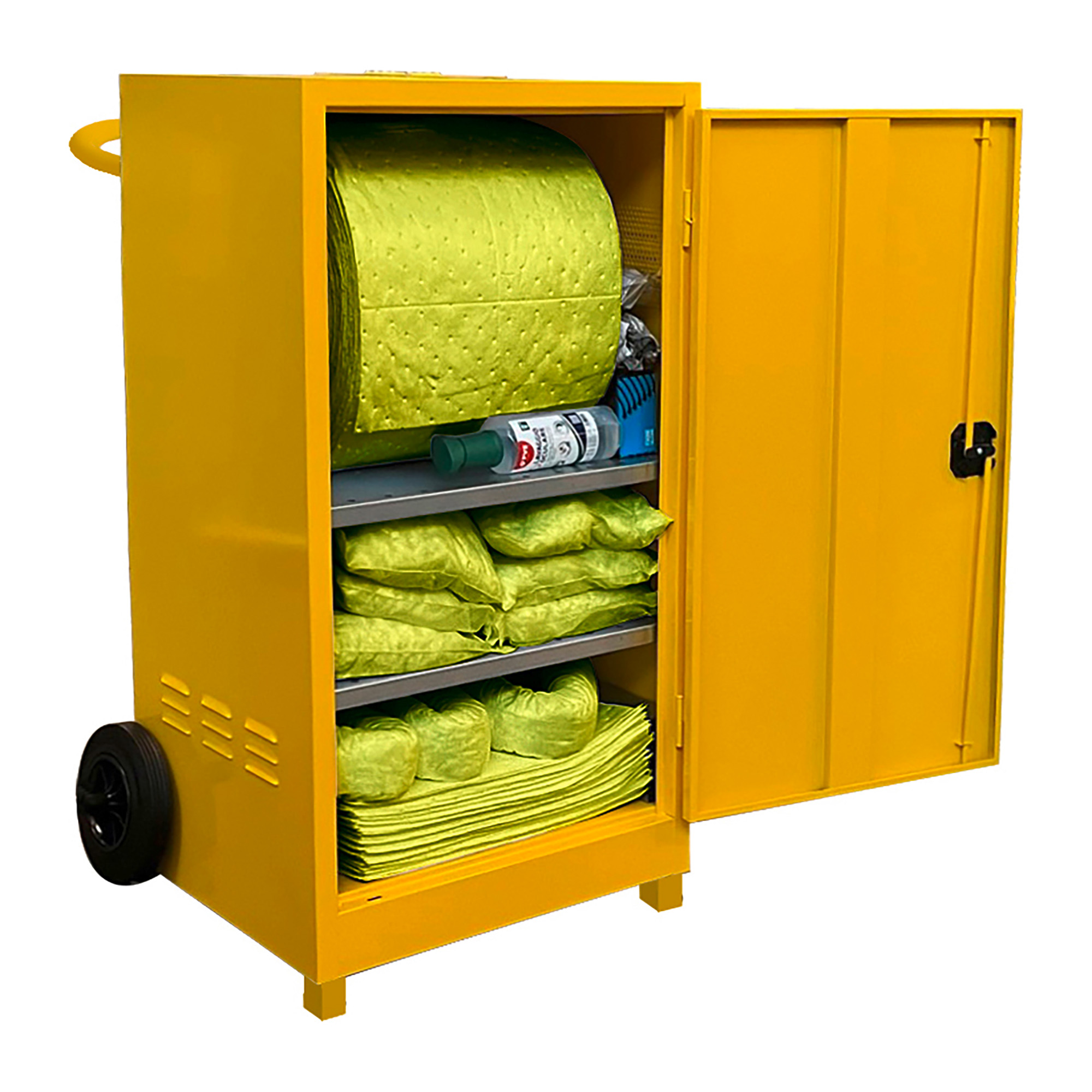 Kit assorbente in armadio metallico carrellato con maniglia realizzato in lamiera di acciaio al carbonio P02 , pretrattato con fosfosgrassaggio in tunnel alte temperature, verniciatura in epossipoliestere colore GIALLO RAL1021 e cottura in galleria termica 180°. Dotato di ripiani di contenimento regolabili in altezza con piedini regolabili anteriori, 2 ruote in gomma posteriori, una maniglia per facilitare il posizionamento, serratura ergonomica in plastica e alluminio con doppia chiave completa di chiusura ad asta con carter copriaste antimanomissione.