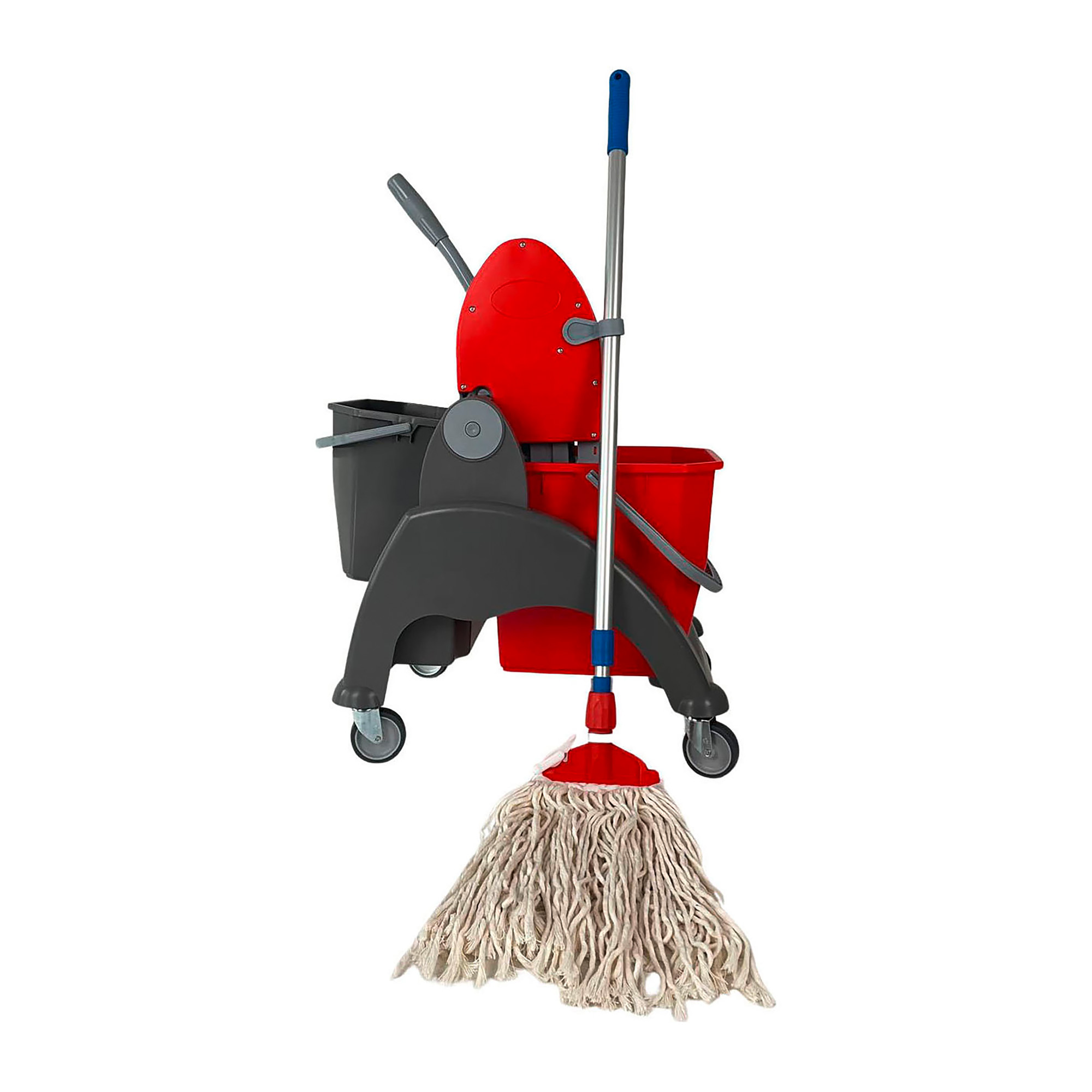 Carrello duo-mop in plastica composto da due pezzi (conforme alle disposizioni HACCP). Stampaggio ad iniezione diretta. Il sistema di aggancio ruote prevede bussole filettate in ottone inserite nello stampo e “annegate” nella plastica. Ruote con cuscinetto nel giro sfere. Completo di manico, pinza e mop.