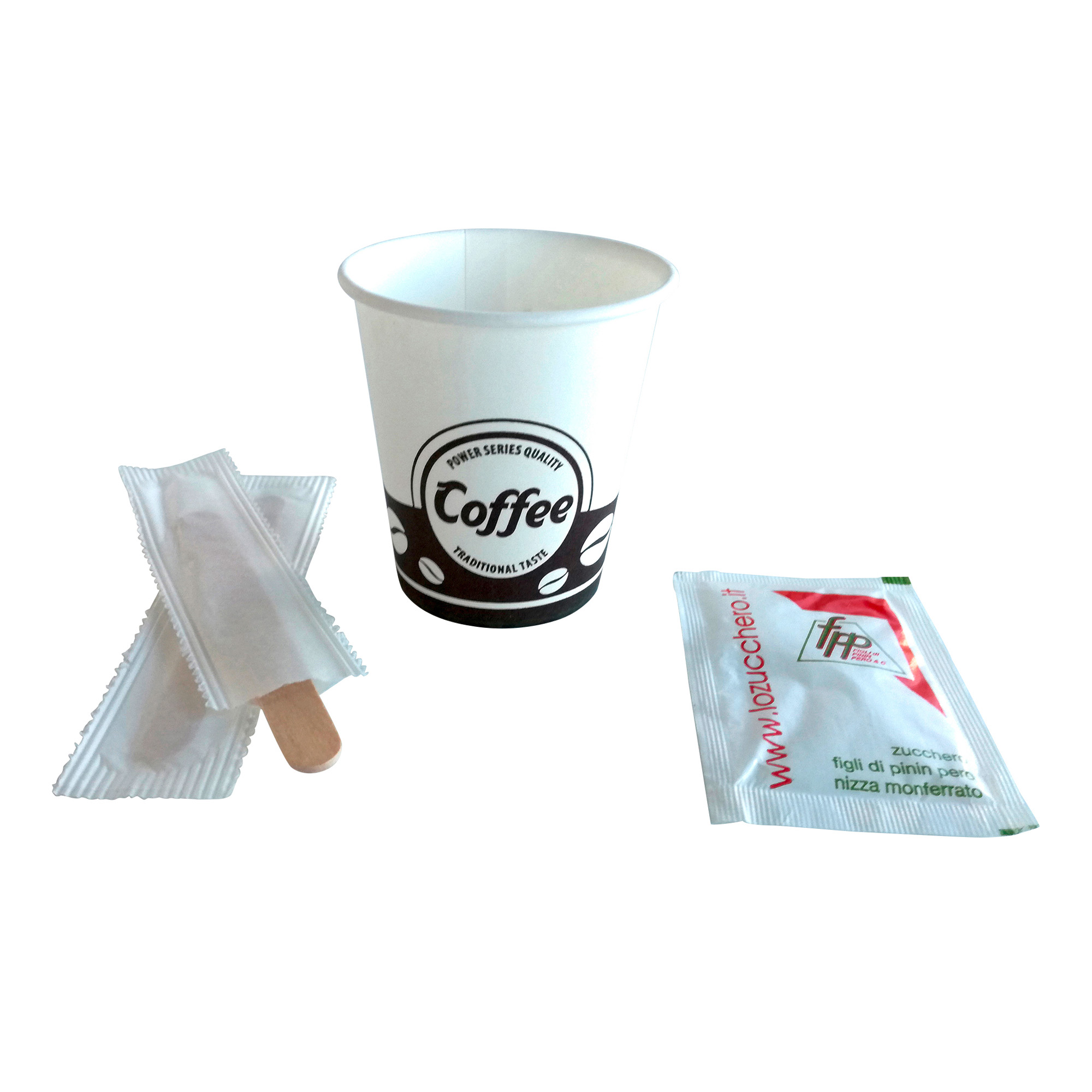 Descrizione dettagliataComodo kit per la degustazione di caffè e similari.Kit composto da 50 bustine di zucchero bianco da 4,0 g, 50 bicchierini carta da 90 cc e 50 palettine legno incartate.