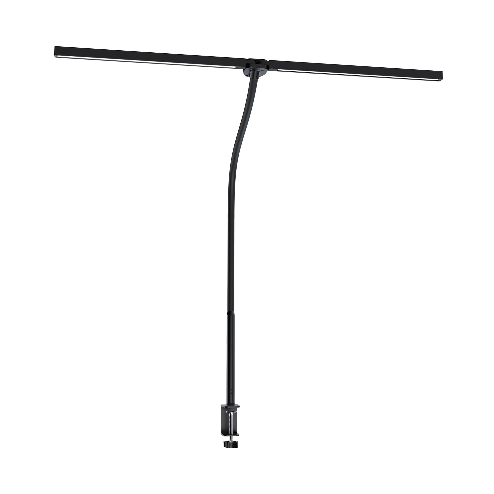 • Lampada da scrivania dal design innovativo con due moduli LED mobili (possono essere uniti in un unico modulo LED) e regolabili grazie al braccio flessibile a collo di cigno. I due bracci possono anche essere ruotati per dirigere il modulo LED all'indietro, ideale quando si utilizzano due schermi • Illuminazione antiriflesso asimmetrica • Montata con una robusta morsa in metallo, realizzata in acciaio/ materiale ABS • Alimentazione, dimmer e controllo colore tramite telecomando incluso • Dimensioni: H 67cm, larghezza di due moduli LED "aperti": 80 cm • Colore nero • Cavo di alimentazione standard 230V. CR 2032 batteria per telecomando non inclusa.