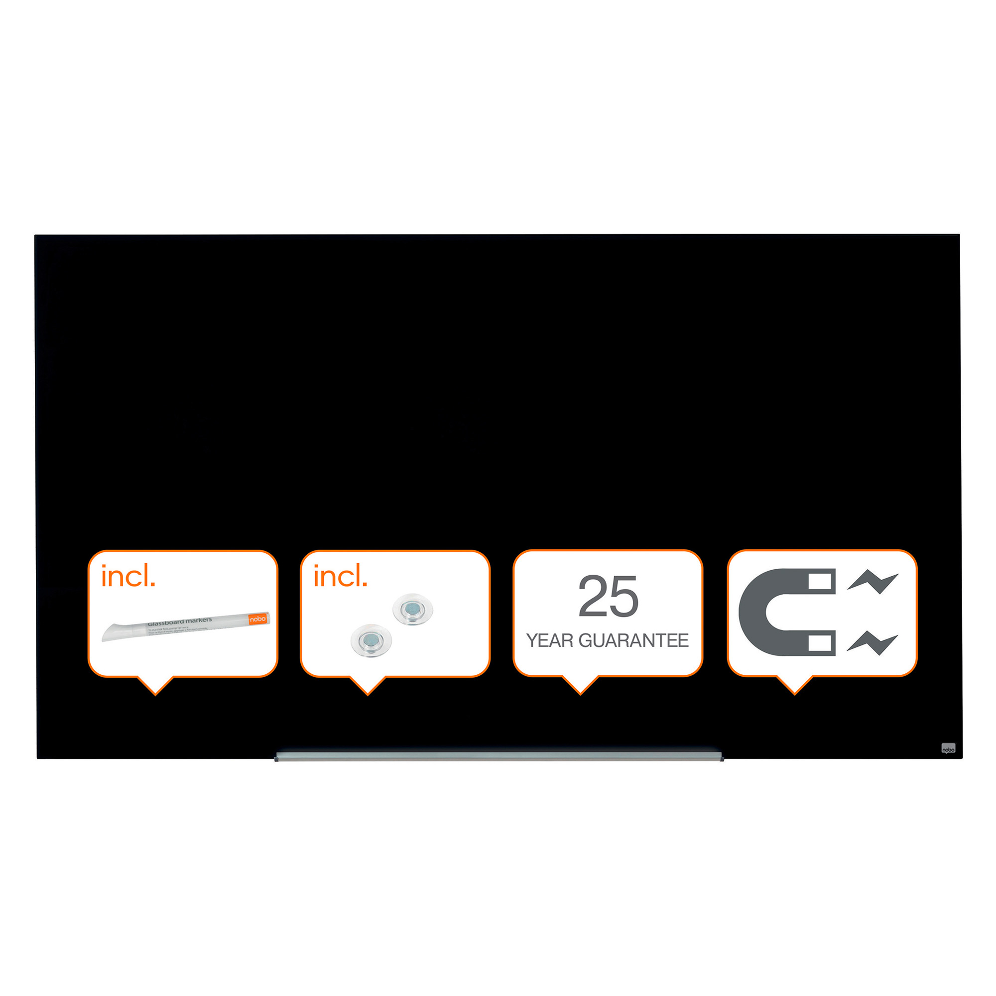 Elegante design senza cornice con portapennarelli removibile. Sistema invisibile di montaggio semplice con accessori per il fissaggio inclusi. Pennarello Nobo e set di magneti extra forti per lavagne in vetro Nobo in dotazione
