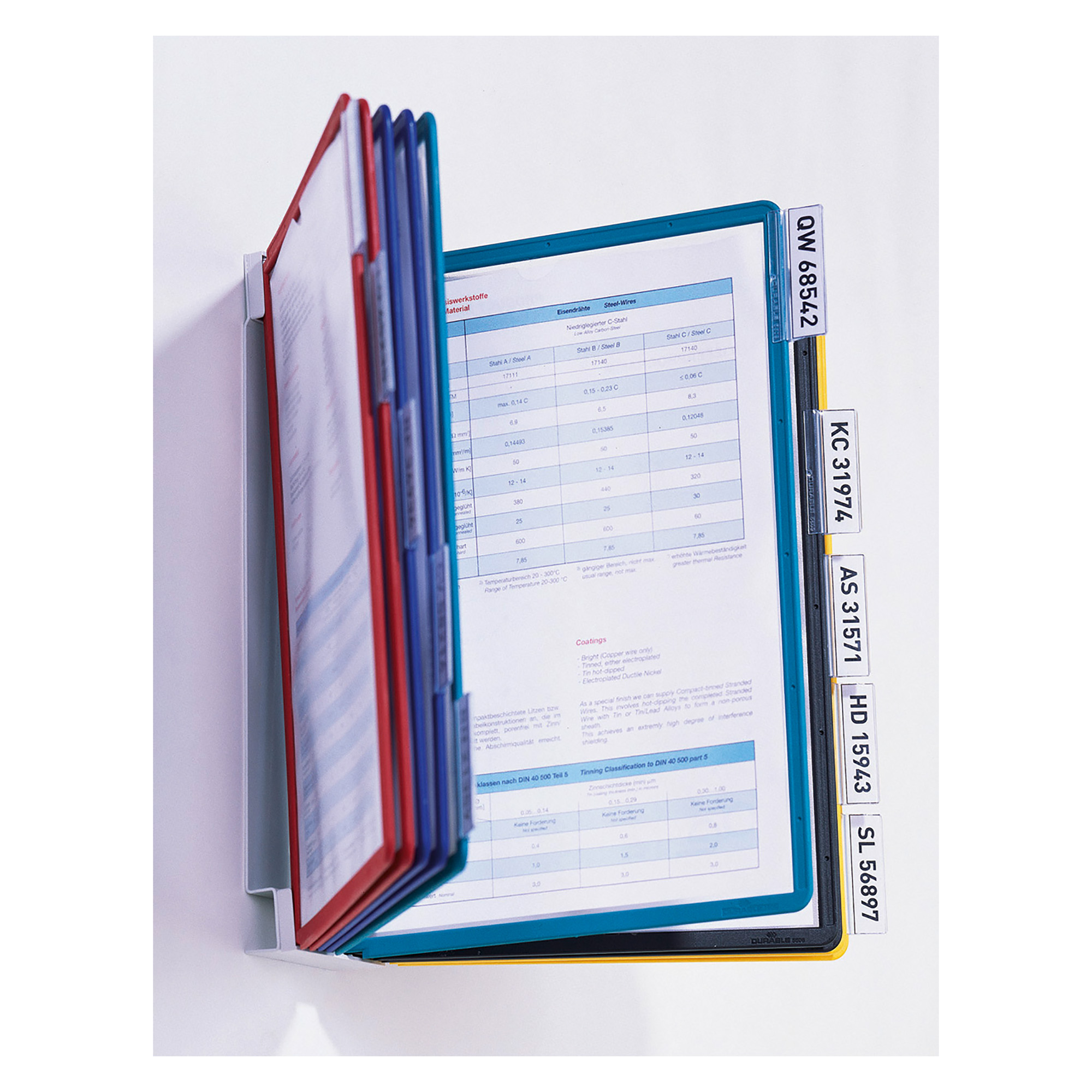 Leggio da parete con 10 pannelli espositivi SHERPA in formato A4, 2 pezzi rispettivamente in nero, rosso, giallo, verde e blu scuro