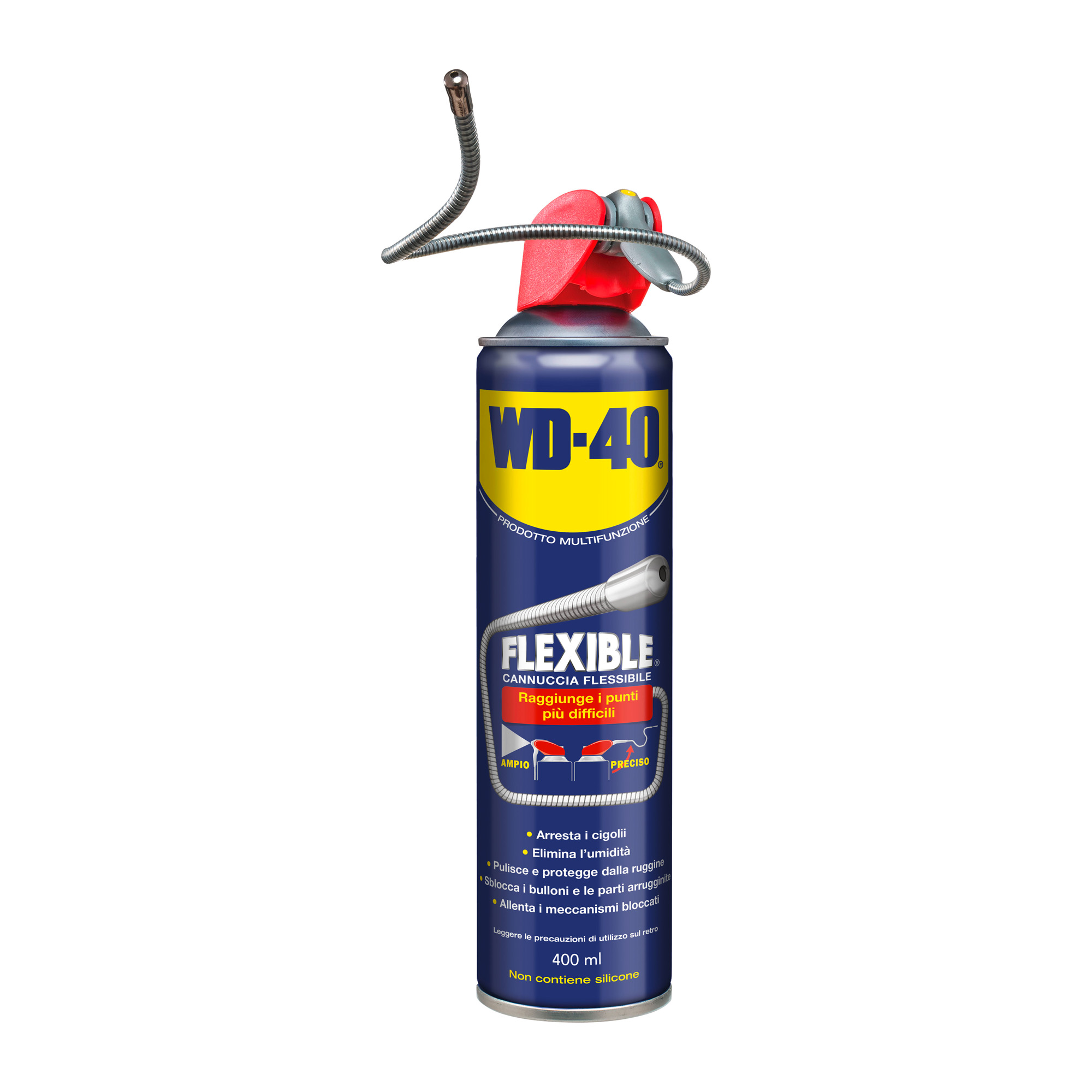 WD-40 Flexible® è dotato di un tubo spray flessibile, realizzato in un metallo estremamente modellabile ma allo stesso tempo resistente all’usura e al calore. L’innovativo tubo spray può essere piegato a piacimento e mantiene la forma desiderata. Permette di raggiungere punti difficili da accedere, evitando il preventivo smontaggio delle parti da trattare.