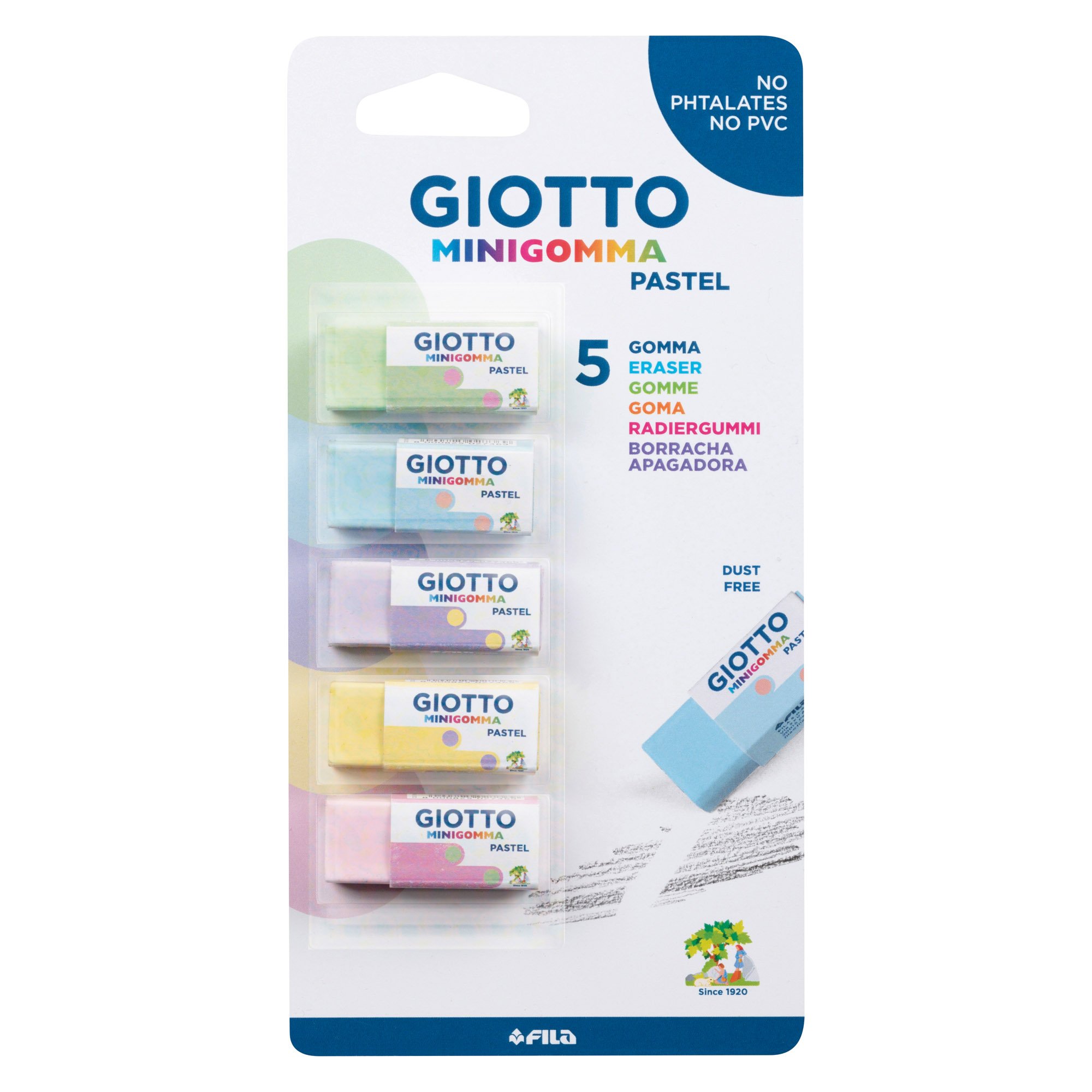 Descrizione dettagliata• Pratica confezione da 5 minigomme fascettate singolarmente in colori pastello (verde, rosa, azzurro, giallo e viola).• Senza PVC• Dimensioni compatte: 38 x 16 x 10 mm.