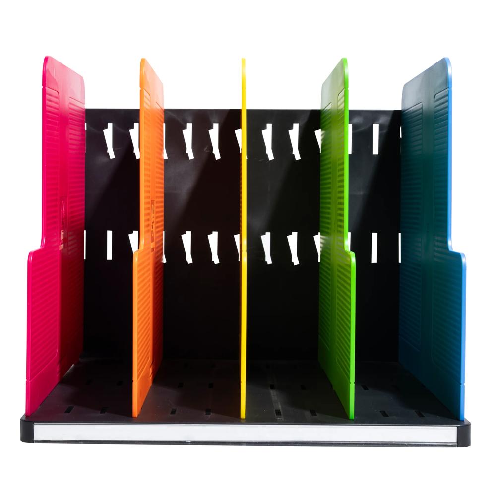 Classificatore verticale con 5 intercalari, in resistente polistirolo di alta qualità. Gli intercalari possono essere posizionati in maniera perpendicolare o in diagonale con possibilità di alternarli. Con una profondità di 30 cm e una larghezza di 29 cm, MODULOTOP si adatta a tutti i tipi di armadi o mensole. MODULOTOP può essere utilizzato da solo o abbinato con MODULODOC su una scrivania o all'interno di un armadio. Dimensioni (PxlxAlt) 300x288x255 mm. Certificazione Blue Angel.