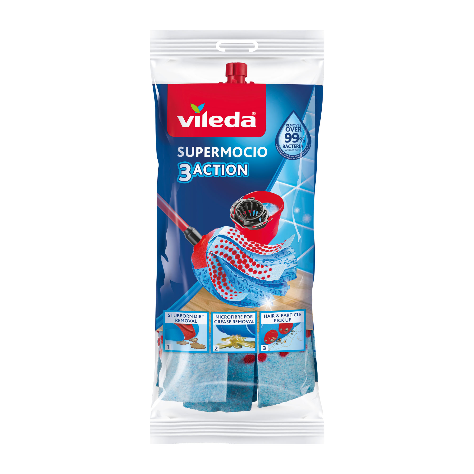 SuperMocio Ricambio 3 Action è il fiocco ancora più efficace contro lo sporco ostinato perchè combina l'azione di 3 diversi materiali pulenti.