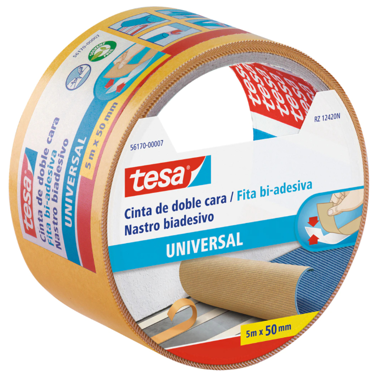 tesa® Nastro biadesivo Universale è un nastro altamente versatile adatto a diversi usi, come la posa di pavimenti, attività manuali e decorazione di interni. E' ideale per il fissaggio di ogni tipo di materiale, purchè la superficie sia stabile piatta e liscia. Il nastro ha un supporto filmico che può essere facilmente tagliato con le mani per una facile e veloce applicazione. Ha una forte adesività e può essere usato per il fissaggio permanente di diversi materiali.