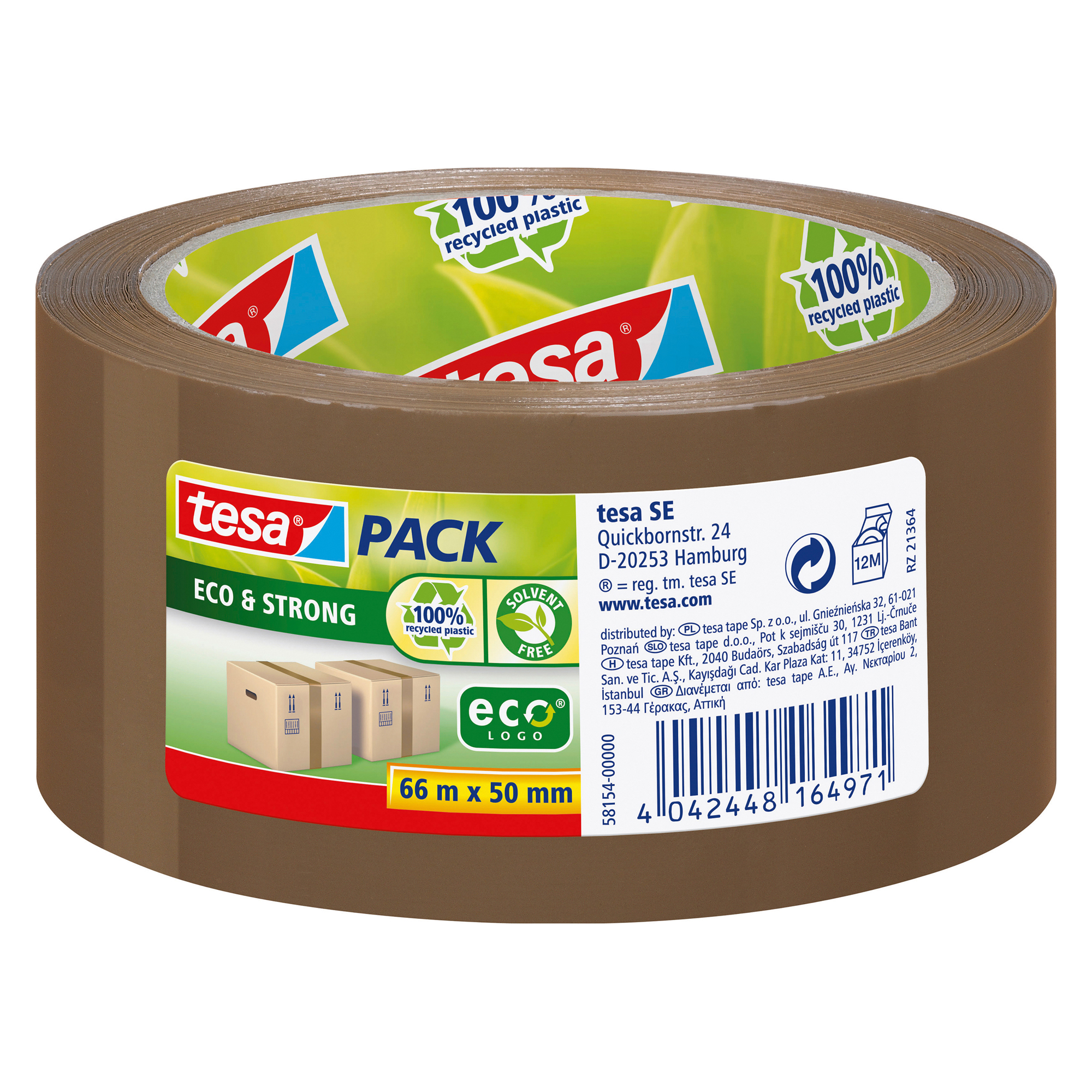 Descrizione dettagliataTesapack Eco & strong è un nastro da imballo ecologico al 100% in pastica riciclata.E' privo di PVC e solventi e offre un eccellente adesione.Forte supporto in PP realizzato con plastica riciclata al 100%. Mandrino realizzato con cartone riciclato al 100%. Etichetta in carta riciclata. Adesivo senza solventi ad elevata resistenza ai raggi UV. Sigillatura ad elevata sicurezza. Svolgimento silenzioso. Utilizzabile con tutti i dispenser manuali della linea tesapack.Massa adesiva acrilico a base acquaSpessore totale: 57 µmSupporto: BOPPCampo di applicazione: Ufficio, A casaSuperfici adatte: CartoneAdesività altaPrivo di solventiResistente agli strappiMateriale: PP (Polipropilene)