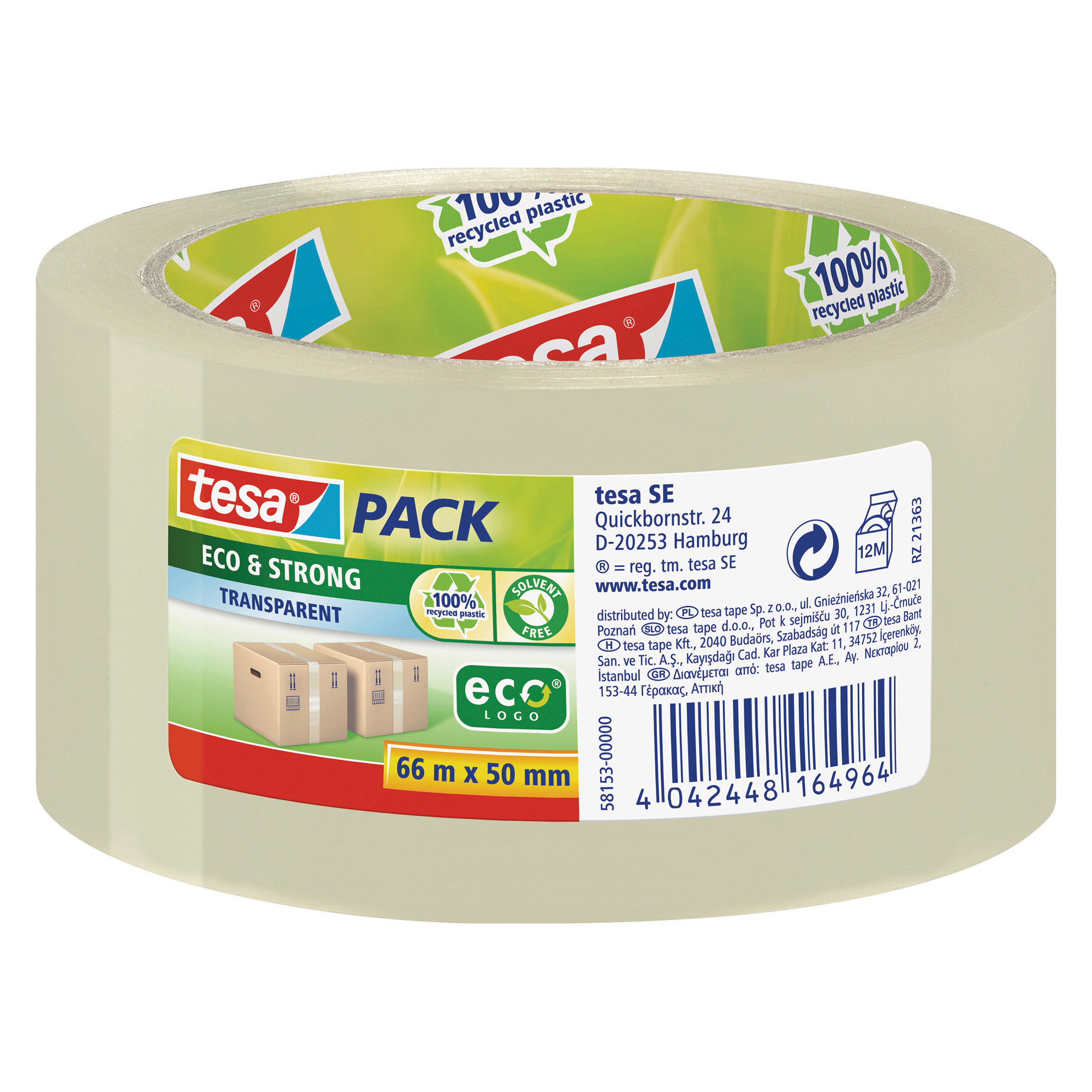 Descrizione dettagliataTesapack Eco & strong è un nastro da imballo ecologico al 100% in pastica riciclata.E' privo di PVC e solventi e offre un eccellente adesione.Forte supporto in PP realizzato con plastica riciclata al 100%. Mandrino realizzato con cartone riciclato al 100%. Etichetta in carta riciclata. Adesivo senza solventi ad elevata resistenza ai raggi UV. Sigillatura ad elevata sicurezza. Svolgimento silenzioso. Utilizzabile con tutti i dispenser manuali della linea tesapack.Massa adesiva acrilico a base acquaSpessore totale: 57 µmSupporto: BOPPCampo di applicazione: Ufficio, A casaSuperfici adatte: CartoneAdesività altaPrivo di solventiResistente agli strappiMateriale: PP (Polipropilene)