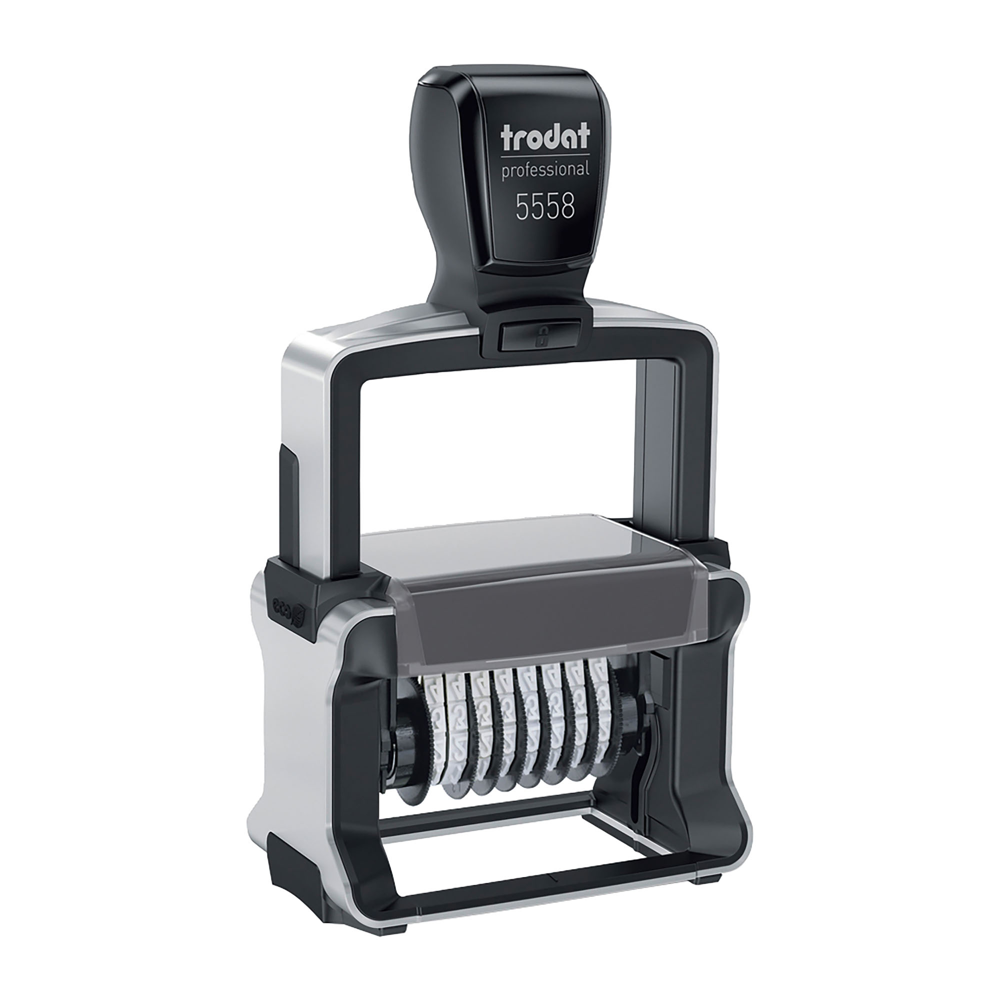 Timbro numeratore autoinchiostrante personalizzabile con testo e logo per uso professionale.