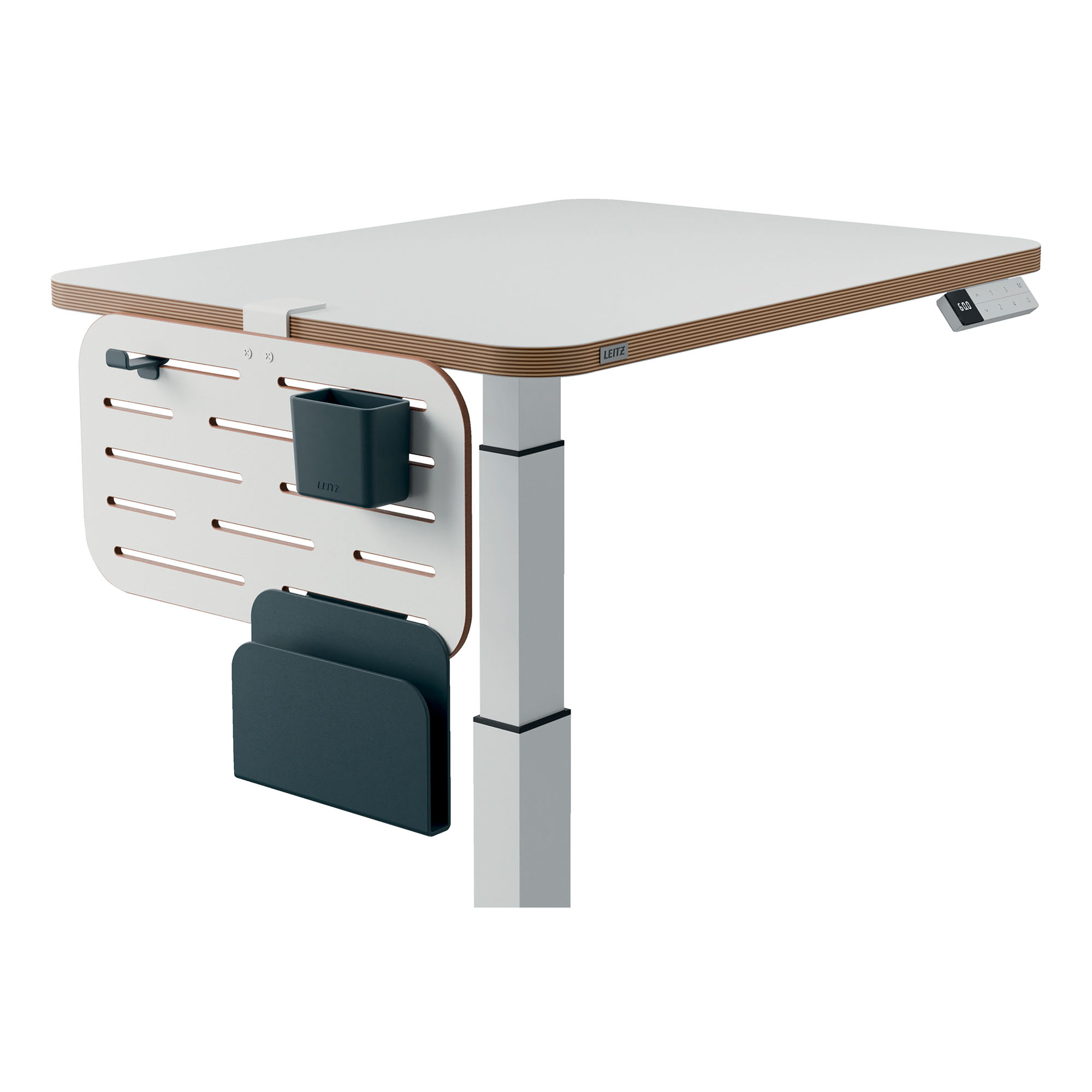 • Pannello Forato Piccolo con Portapenne, Gancio e Portariviste - Disponibile da Ottobre 2024 • Mantieni la tua scrivania in ordine e sfrutta al massimo lo spazio disponibile con l'organizer da scrivania Leitz Ergo • Questi esclusivi organizer da scrivania verticali sono facili da montare sopra o sotto una scrivania o un tavolo e creano spazio di archiviazione istantaneo per qualsiasi cosa, dalle cuffie ai taccuini e alle penne. Mantieni tutti i tuoi elementi essenziali organizzati, facili da trovare e libera spazio prezioso sulla scrivania • Posiziona semplicemente i robusti accessori forniti in plastica riciclata all'85% (1 portablocco, 1 portapenne e 1 gancio per appendere le cuffie) sul pannello forato per creare il tuo spazio di lavoro personalizzato • Progettato in Germania e compatibile con la maggior parte delle scrivanie con uno spessore massimo del piano del tavolo di 35 mm, l'organizer con pannelli forati è facile da installare e costituisce una preziosa aggiunta alle scrivanie Leitz Ergo (793-938, 833-566 o 793-941) • Il pannello forato è realizzato in resistente MDF da 8 mm per garantire resistenza e stabilità, mentre i morbidi cuscinetti in gomma proteggono la superficie della scrivania dai graffi • Questo organizer moderno e minimalista con pannello forato è ideale per la casa o l'ufficio per migliorare il comfort e massimizzare la produttività • La nostra missione è fornire soluzioni che permettano alle persone di prosperare sul lavoro e oltre, promuovendo una salute mentale e un benessere fisico positivi • Combinabile con molti altri prodotti Leitz Ergo per personalizzare la tua postazione di lavoro flessibile e individuale in modalità sit, stand & move • Rimani attivo e Feel Good con Leitz.