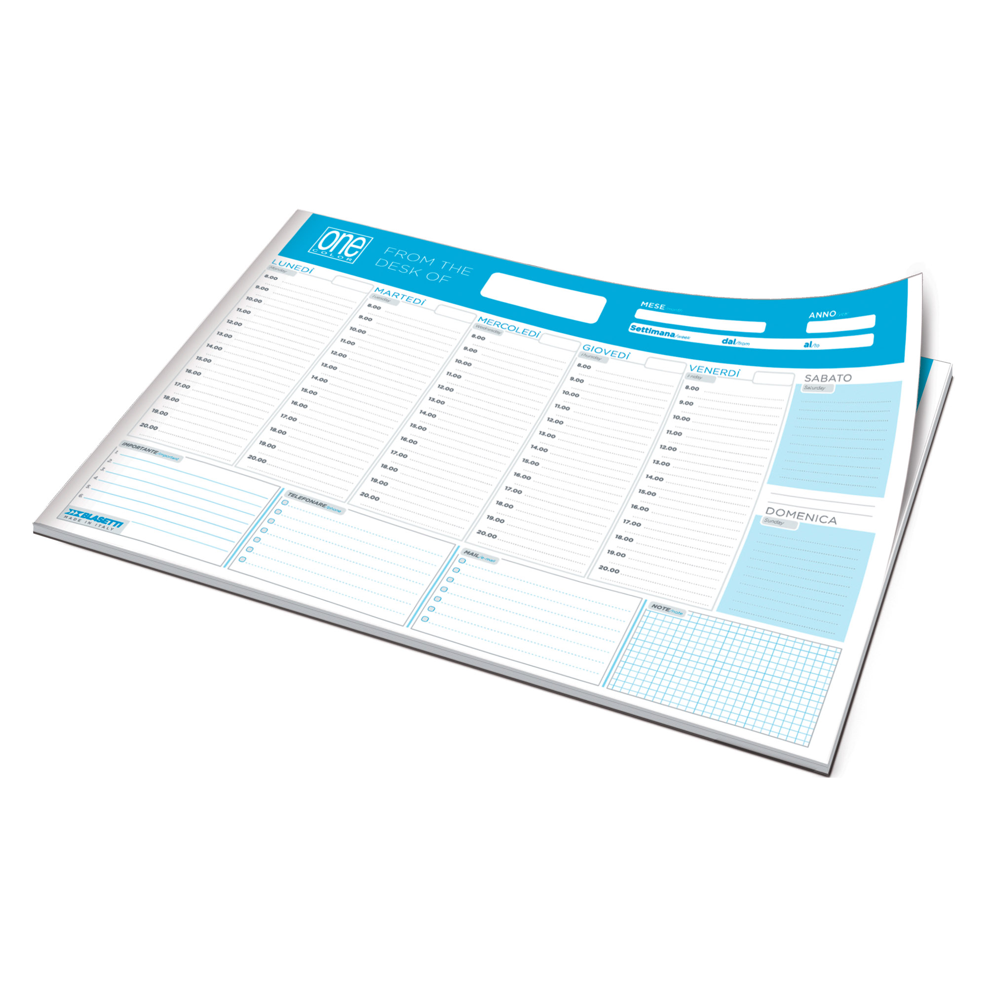 • Da Scrivania • Formato A3 (42×30 cm) collato in basso • 60 fogli di carta da 80 g, rappresentativi delle 53 settimane dell’anno • Ideale per l’ufficio ma anche per il tempo libero • E’ completato dalle sezioni “Importante”, “Telefonare”, “Mail”, “Note”.