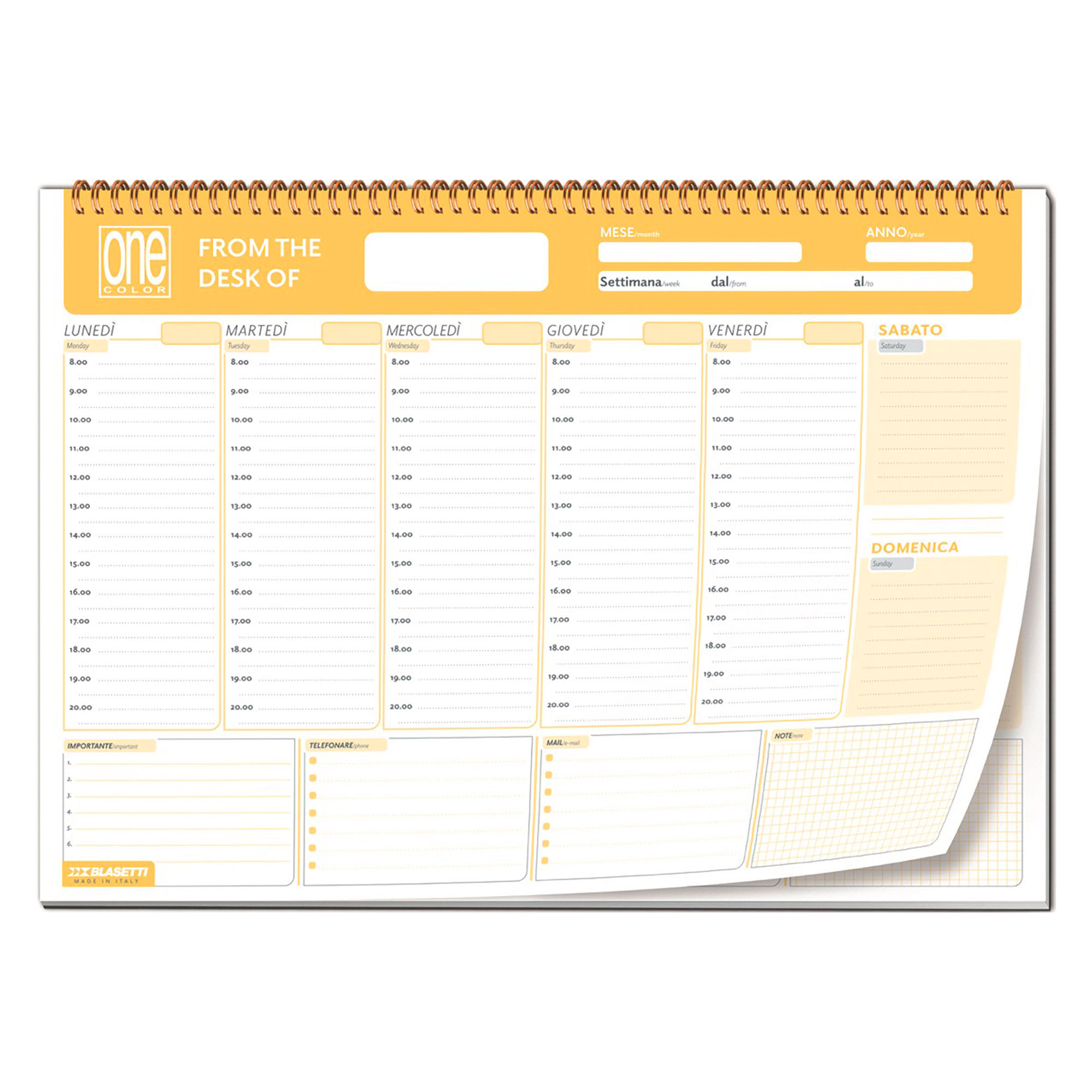 • Da Scrivania • Formato A3 (42×30 cm) spiralato in testa • 60 fogli di carta da 80 g, rappresentativi delle 53 settimane dell’anno • Realizzato in due varianti colore “BLU INTENSO” e “GIALLO ORO” • Ideale per l’ufficio ma anche per il tempo libero • E’ completato dalle sezioni “Importante”, “Telefonare”, “Mail”, “Note”.