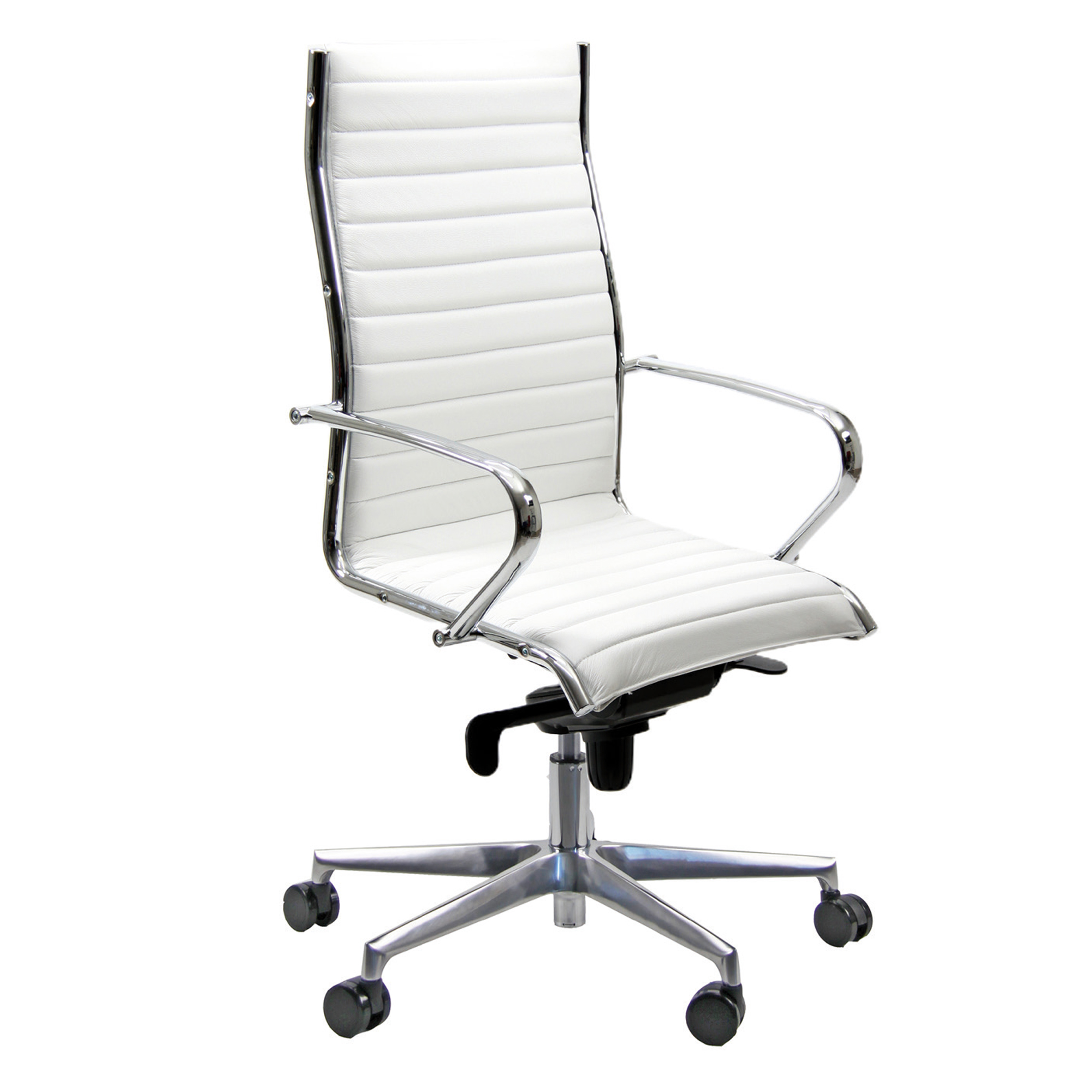 Poltrona direzionale con schienale alto. Struttura e braccioli in acciaio cromato, rivestimento in pelle. Base in acciao sezione ellittica. Meccanismo multiblock oscillante con fulcro avanzato, regolazione in altezza con pistone a gas (corsa 11cm). 16kg. Rivestimento seduta in tessuto "TOP - vera pelle smerigliata". Braccioli inclusi (non rimovibili). Altezza totale: 105-116cm; Profondità tot: 68cm; Alt. schienale: 60cm; Larghezza schienale: 48cm; Larghezza sedile:50cm; Profondità sedile: 50cm; Alt.sedile: 42-54cm.