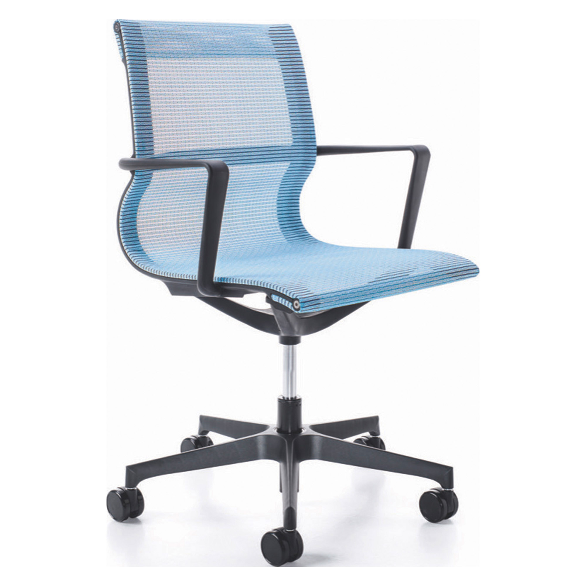 Poltrona linee slim, design ultraleggero. Struttura in rete portante rivestita. Schienale fisso. Elevazione a gas. Meccanismo oscillante libero.