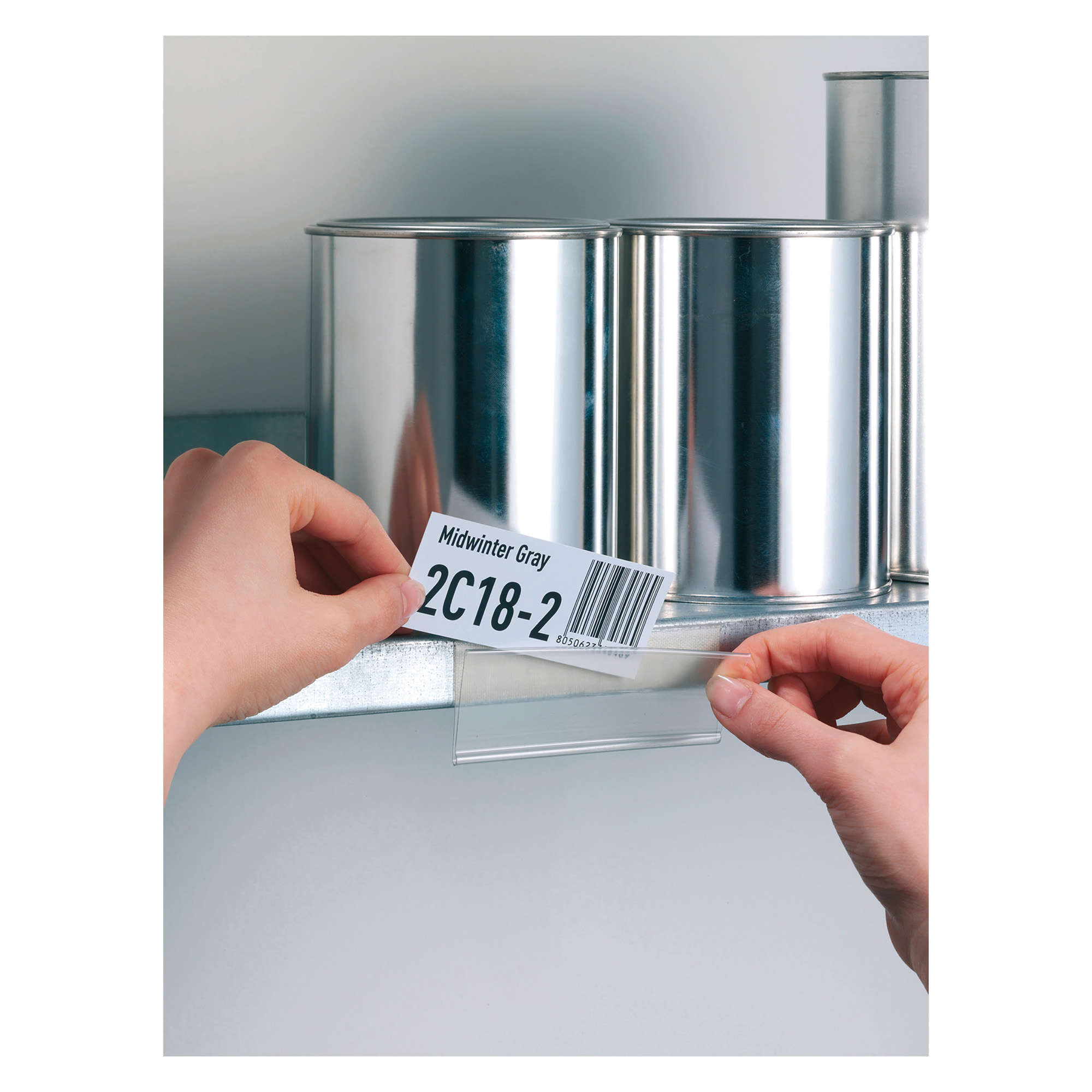 Portaetichette adesivi in plastica per schedari, scaffali, armadietti, cassetti e apparecchiature tecniche. Dotato di apertura superiore e sul lato corto per facilitare l'inserimento e la rimozione dell'inserto. Ritagliabile alla lunghezza desiderata. Inserto in cartoncino incluso nella confezione.