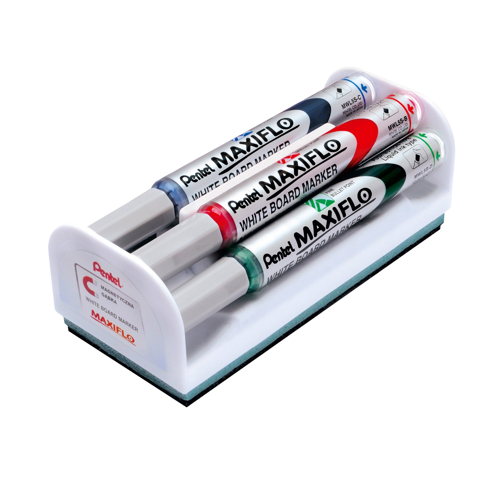 All'interno della confezione sono presenti 4 marcatori Maxiflo per lavagne bianche (1 nero,1 blu,1 rosso e 1 verde) cancellabili a secco.
