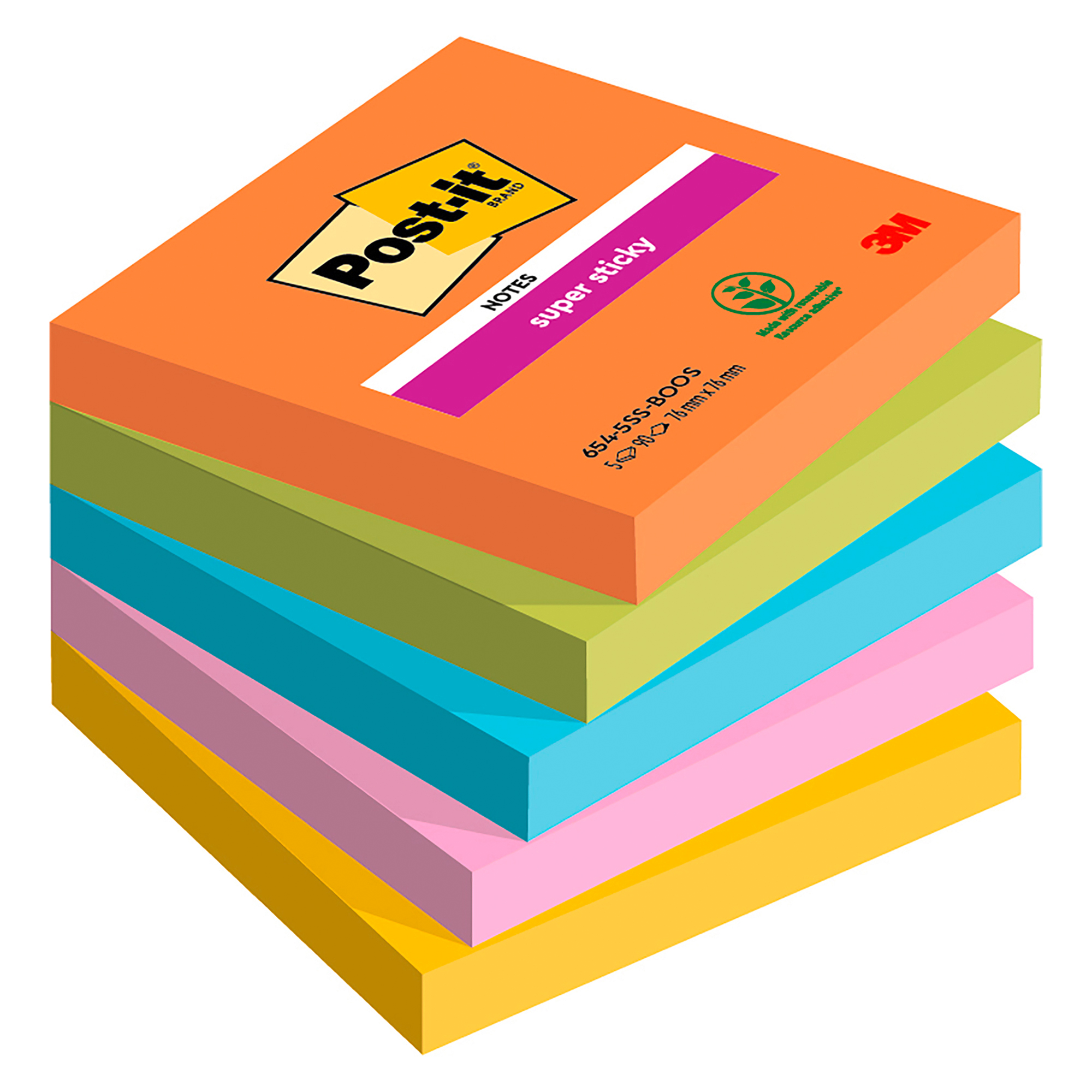 I foglietti Post-it Notes Super Sticky sono rivestiti sul retro con l’adesivo originale 3M riposizionabile realizzato con risorse rinnovabili (prodotto al 60% con pianta non alimentare che cresce annualmente).