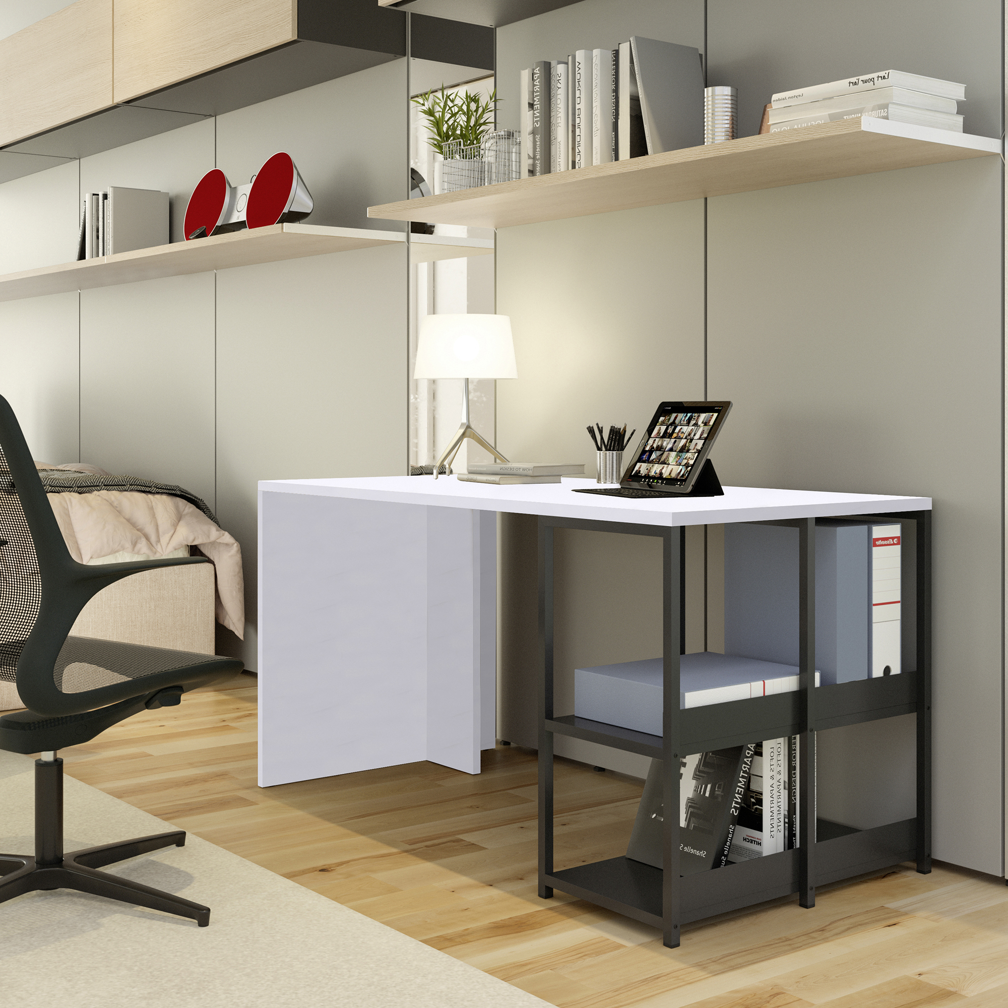 La personalità del design è enfatizzata dal bilanciamento cromatico dei materiali, con il piano ribaltabile in nobilitato melaminico (conforme alle norme UNI e EN classe E1) bianco o rovere in accostamento con il nero opaco della struttura metallica.