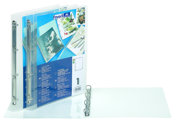 Realizzati in polipropilene trasparente colorato con speciale finitura rigata. Copertina con tasca per la personalizzazione. Disponibili in 5 colori: arancio, fucsia, verde, azzurro e neutro. Formato interno 22x30 cm. con meccanismo a 4 anelli tondi ø 30 mm. e ø 15 mm. Made in Italy