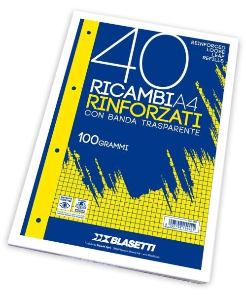 Descrizione dettagliataRICAMBI RINFORZATI IN PLASTICA:- Ricambi rinforzati in plastica a prova di strappo.- Formato A4.- Confezione da 40 fogli.- Grammatura 100gr.