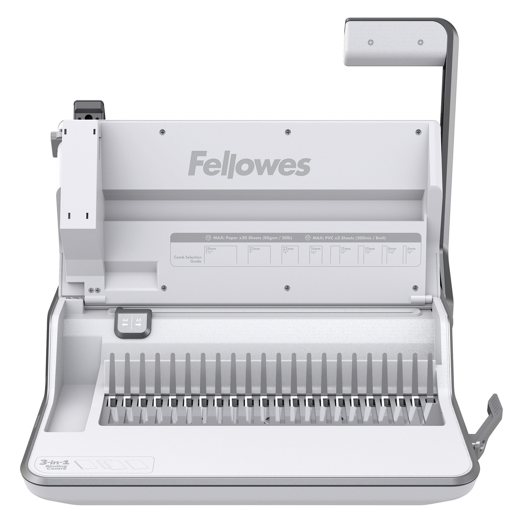 Questa esclusiva stazione di rilegatura 3 in 1 permette di rilegare, spillare o forare i documenti tutto con la stessa macchina.