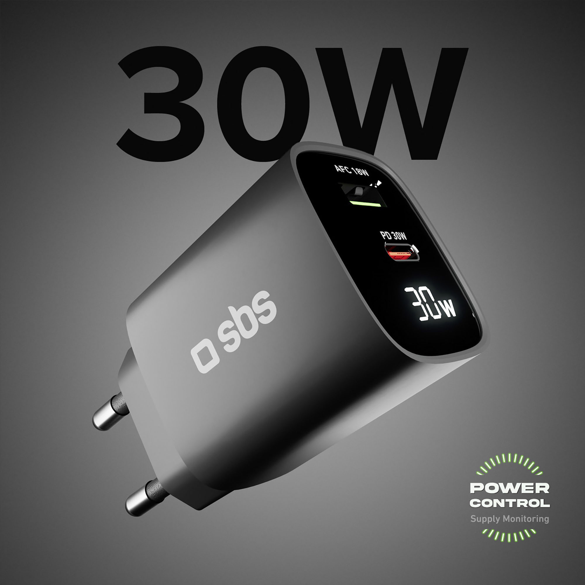 Caricabatterie da parete Power Control 30W Un alimentatore progettato per offrire ricarica rapida ed efficiente per vari dispositivi elettronici, tra cui smartphone, tablet e laptop.