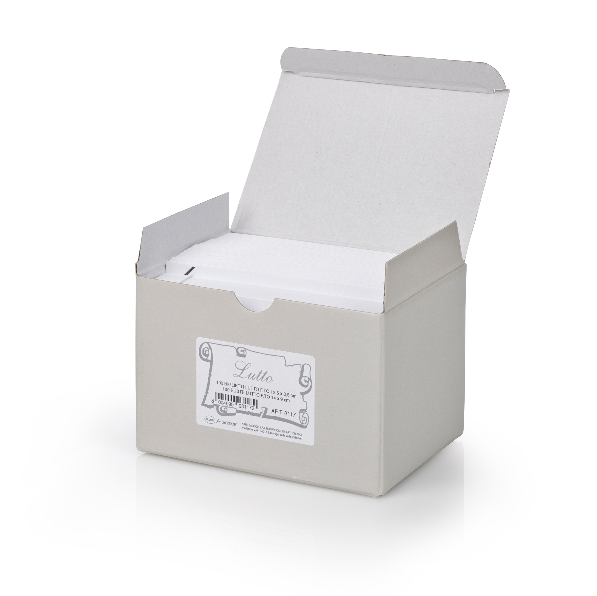 Busta e biglietto bianco con stampa a lutto in angolo. Biglietti da 200gr coordinati a buste con patella e taglio a punta da 85gr. Confezionate in scatole da 100 biglietti + 100 buste.
