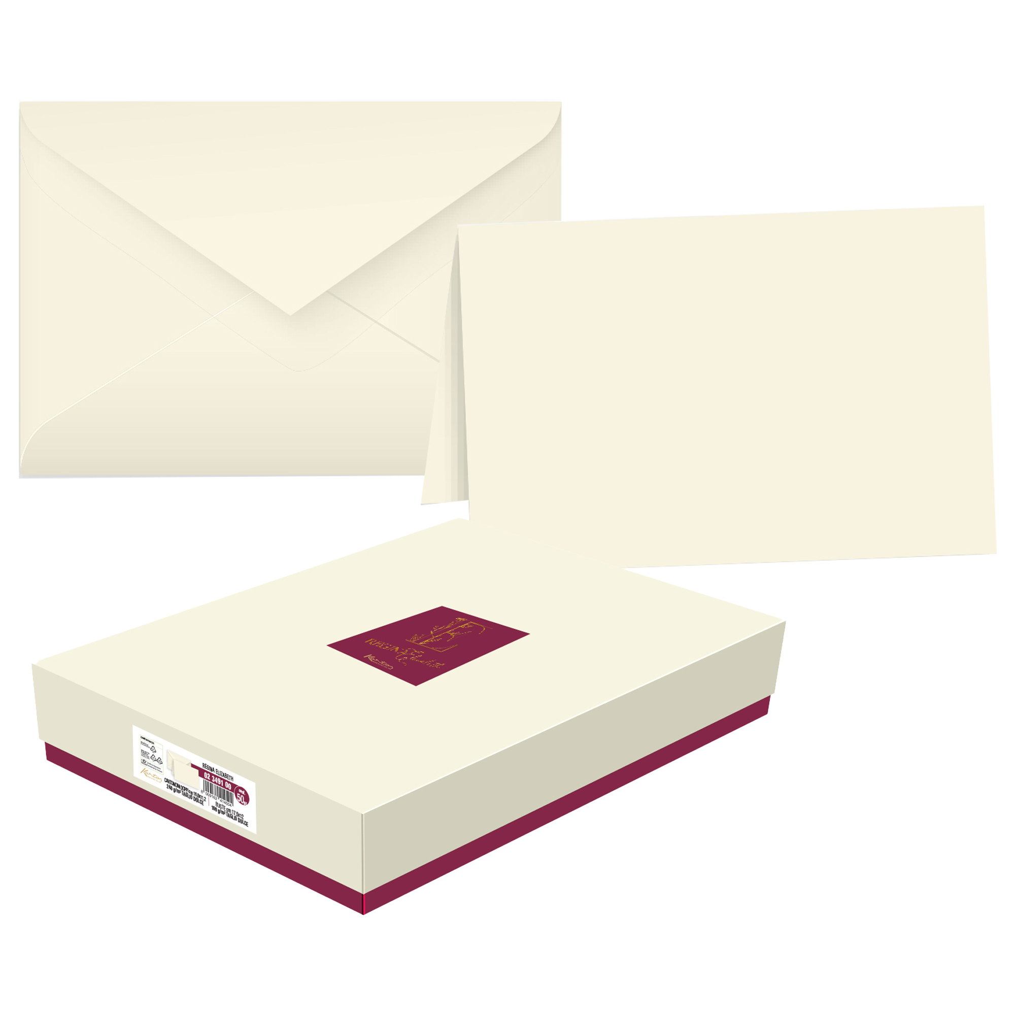 Linea classica avorio con sottile rigatura. Partecipazione: confezione comporta da 50 biglietti partecipazione con taglio dolce a libro avorio da 200gr formato 114x170mm; 50 buste taglio dolce avorio da 100gr formato 120x180mm con patella gommata e taglio a punta.