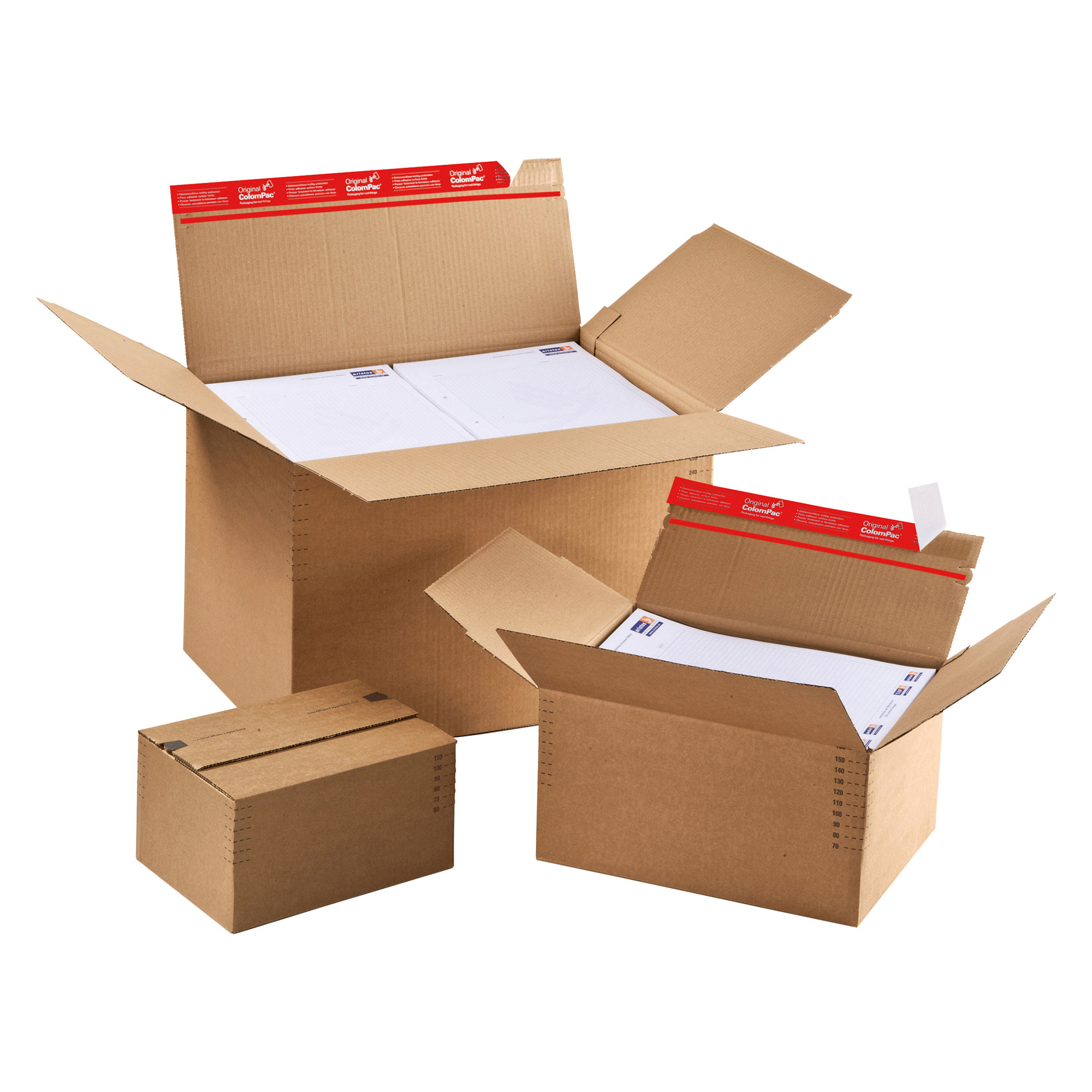 Descrizione dettagliataScatole americane automontanti ad altezza regolabile.In robusto cartone ad onda singola da 365g/m2 automontanti con scanalature per regolare l’altezza.Con un’unica scatola è possibile imballare articoli con differente altezza.