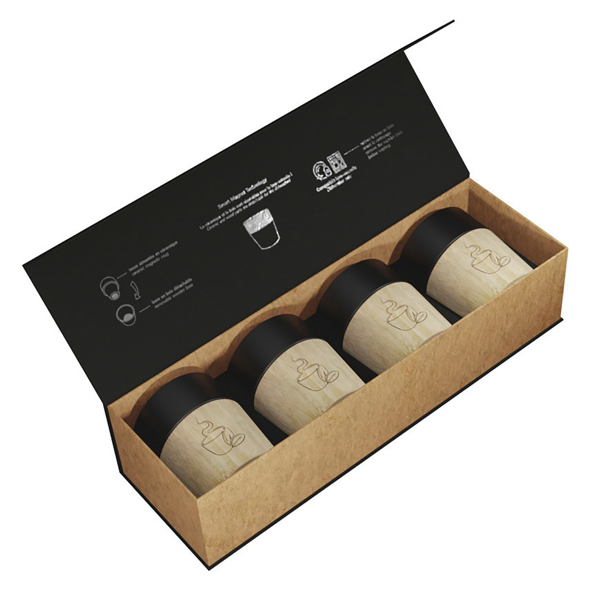 Descrizione dettagliataSCX.design Set 4 tazze caffè magnetiche in ceramica D06 - NeroNumero articolo: 1PX08790Marchio: SCX.designColore: NeroMateriali: Ceramica, legno di albero della gomma (rubberwood)Caratteristiche principali:Set composto da 4 tazze in ceramica da 150 ml, perfette per caffè corto o lungoBase magnetica in legno removibile per una pulizia facile e veloceTazze lavabili in lavastoviglie, pratiche per l’uso quotidianoTecnologia a incastro magnetico intelligente tra tazza e baseConfezione regalo in carta kraft riciclata con chiusura magnetica, elegante e sostenibilePossibilità di incisione laser sulla base in legno per una personalizzazione eco-friendlyDesign moderno e raffinato, adatto sia per casa che per ufficioSpecifiche tecniche:Altezza: 9,0 cmDiametro: 7,3 cmCapacità: 150 ml per tazzaPeso totale: 240 gDimensioni confezione: 34,5 x 12 x 9,5 cmUn set perfetto per chi cerca stile, funzionalità e sostenibilità in un unico prodotto: l’ideale per amanti del caffè e regali aziendali di design.