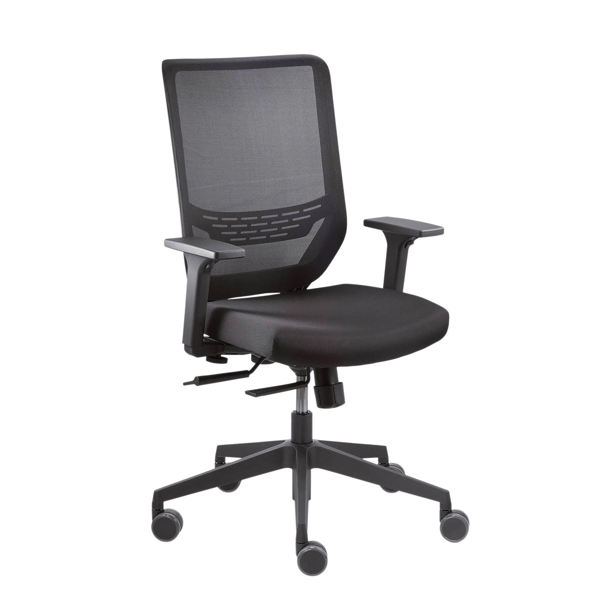 Supporto lombare regolabile in altezza (cm. 6), base di sicurezza antiribaltamento diametro Ø 69 cm in poliammide nera rinforzata fibra di vetro. Ruote di sicurezza autofrenanti in funzione del carico specifiche per pavimenti duri. Rivestimento del sedile: tessuto ignifugo nero.