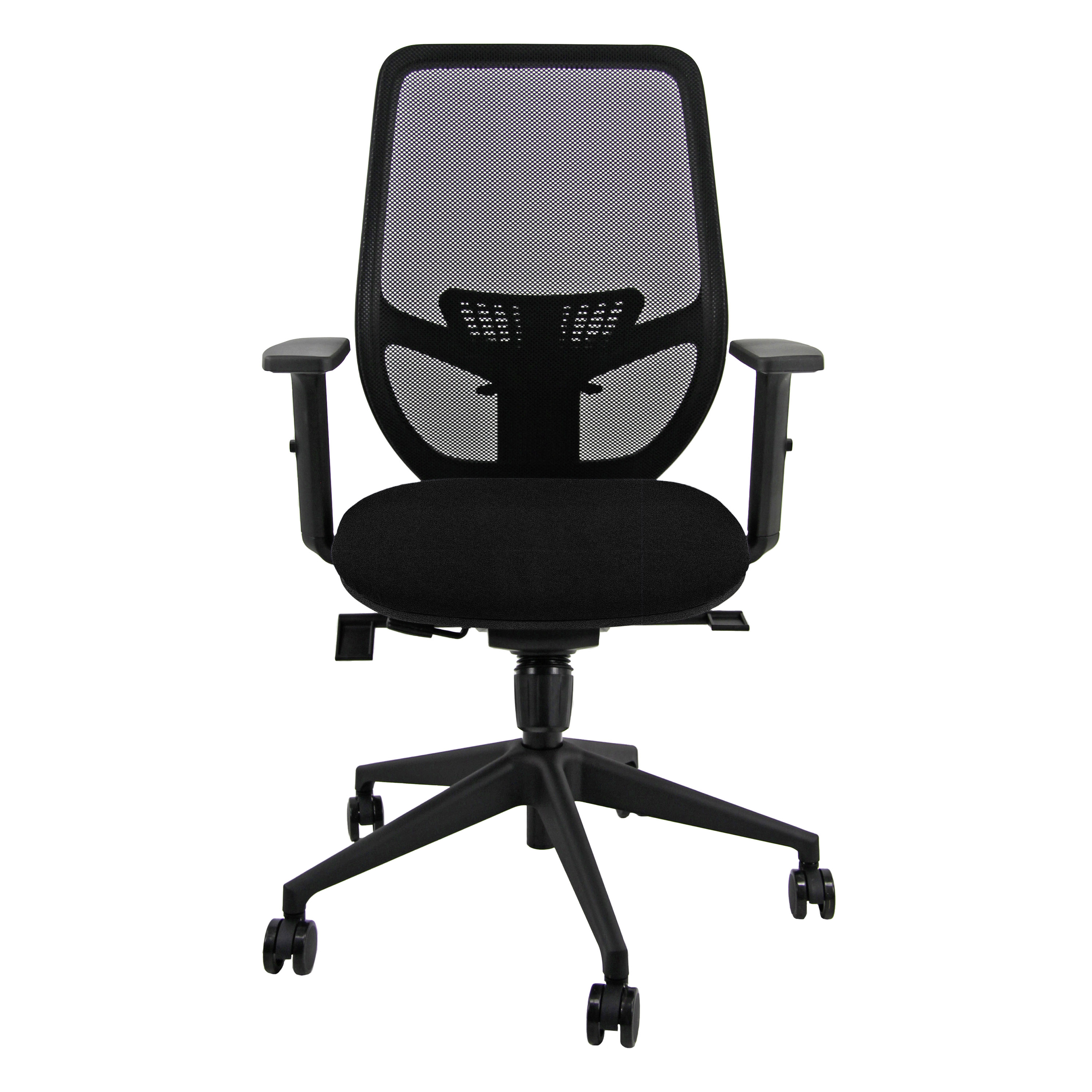 Sedia girevole su ruote operativa con schienale in rete di colore nero.