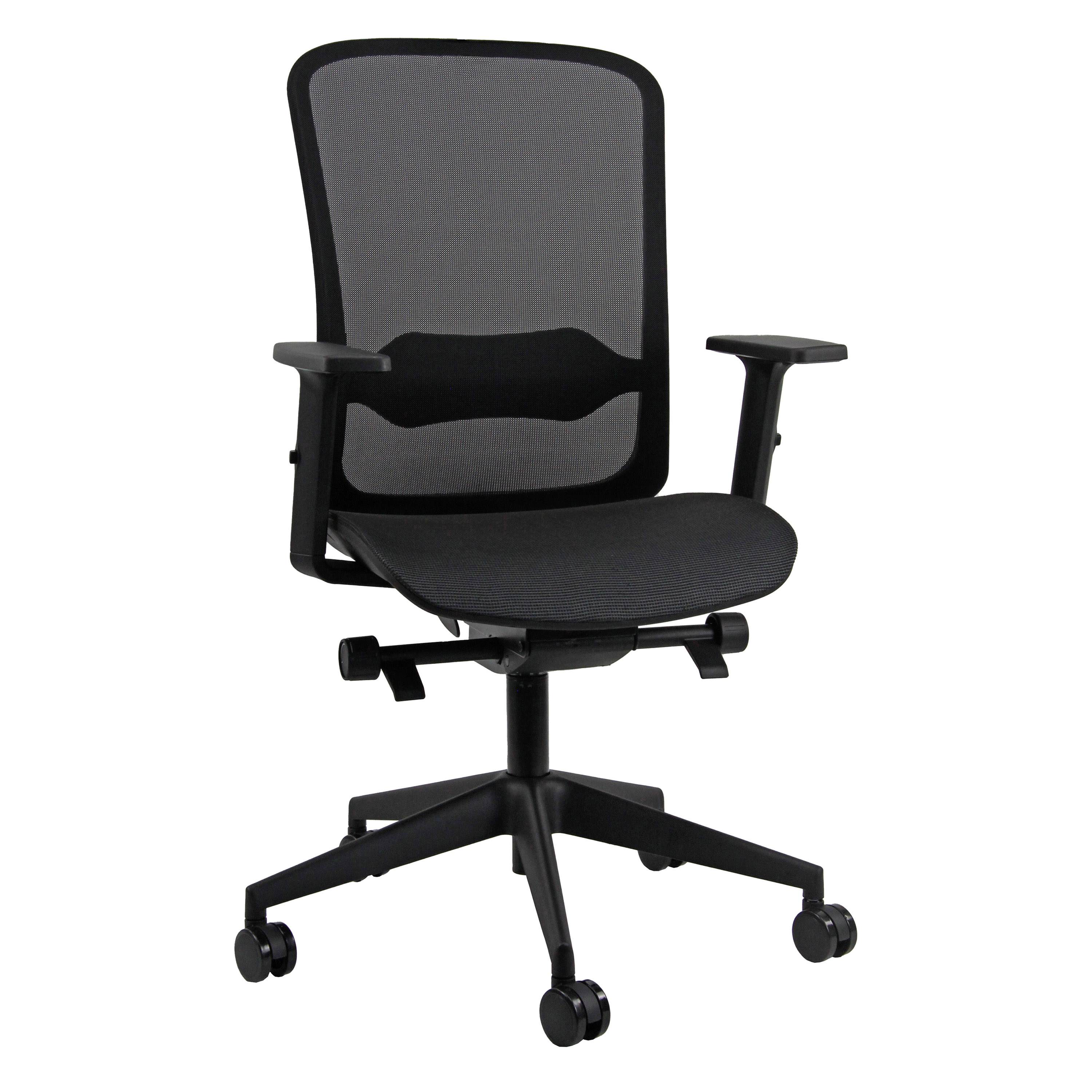 Sedia girevole su ruote semidirezionale con schienale e seduta in rete di colore nero.