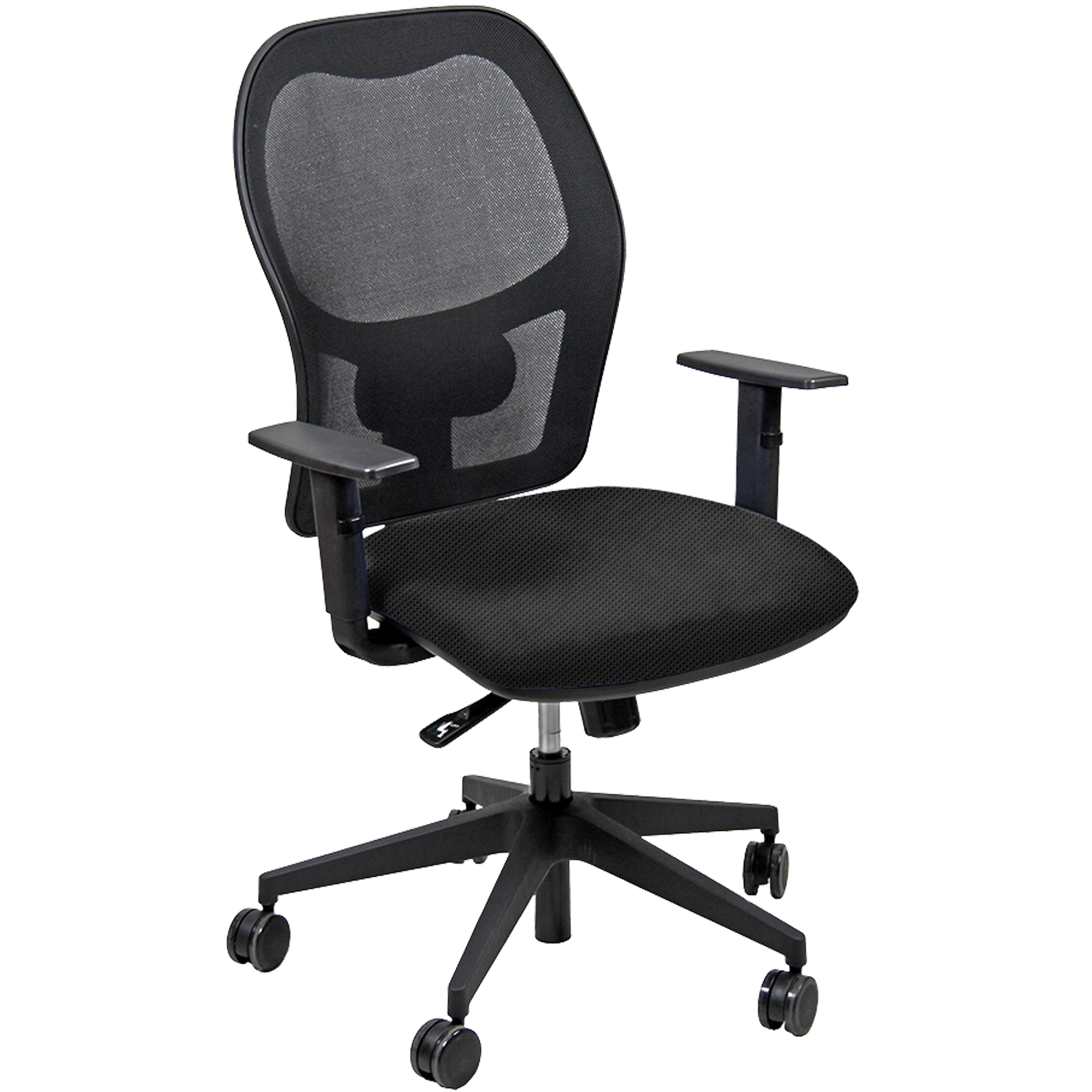 Seduta operativa girevole con elevazione a gas, meccanismo syncro, 4 blocchi anti shock e meccanismo a contatto permanente. Schienale con supporto lombare regolabile. Completa di braccioli regolabili. Rivestimento in tessuto "SUPER - Target" 100% poliestere idrorepellente antimacchia e reazione al fuoco classe 1. Alt.tot: 102-113cm; Prof.tot: 68cm; Alt.schienale: 60cm; Largh.schienale: 48cm; Largh.sedile: 48cm; Prof.sedile: 46cm; Alt.sedile: 42-54cm.