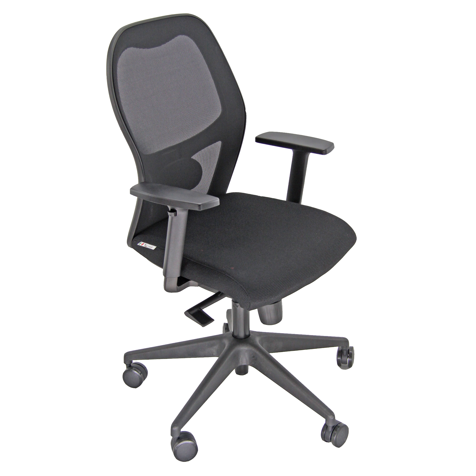 permanente - schienale con supporto lombare regolabile - sedile intercambiabile con traslatore;. Schienale in rete portante e sedile in memory foam con rivestimento in tessuto "PLUS - Ignifugo standard" 100% fibra modacrilica e reazione al fuoco classe 1. Base in nylon, braccioli regolabili. Elevazione a gas. Altezza totale: 102-113cm; Profondità totale: 68cm; Altezza seduta: 42-54cm; Larghezza sedile: 51cm; Larghezza sedile con braccioli: 66cm.