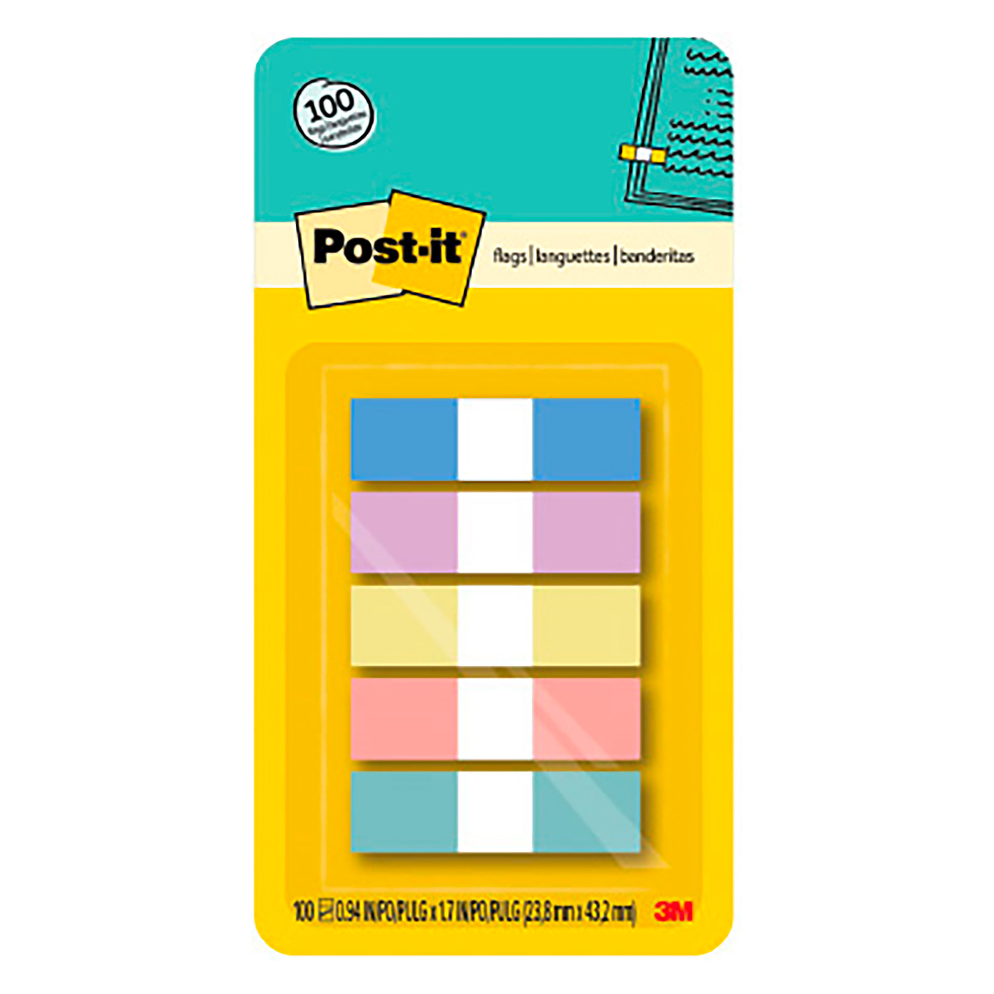UN DISPENSER CON CINQUE COLORI DI BANDIERINE: Un dispenser portatile a comparsa con cinque blocchetti da 20 bandierine Post-it ciascuno, di dimensioni 11,9 mm x 43,2 mm, in diversi colori pastello accattivanti: blu, viola, giallo, rosa e verde (100 bandierine in totale)