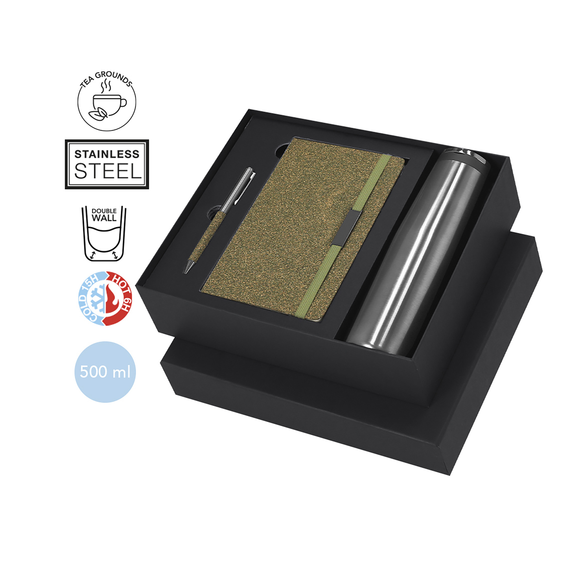 Il set include: - Bloc notes con copertina rigida, con 80 pagine a righe, banda elastica con clip metallico e segnalibro in tinta. - Penna in alluminio con finitura cromata e impugnatura in Fibra di Tè, meccanismo a rotazione e inchiostro blu. - Contenitore termico a doppia parete realizzato in acciaio inox da 500ml, con tappo a vite e maniglia metallica.