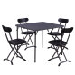 Set pieghevole composto da un tavolo quadrato e quattro sedie. Struttura in acciaio verniciato con vernici epossidiche color antracite, top in HDPE di colore antracite. Il set è consegnato montato e contenuto in due cartoni.Articolo destinato ad esclusivo uso domestico. Non adatto ad uso pubblico. Set composto da:1 tavolo H73 x P86 x L86cm 4 sedie H80 x P36 x L41cm