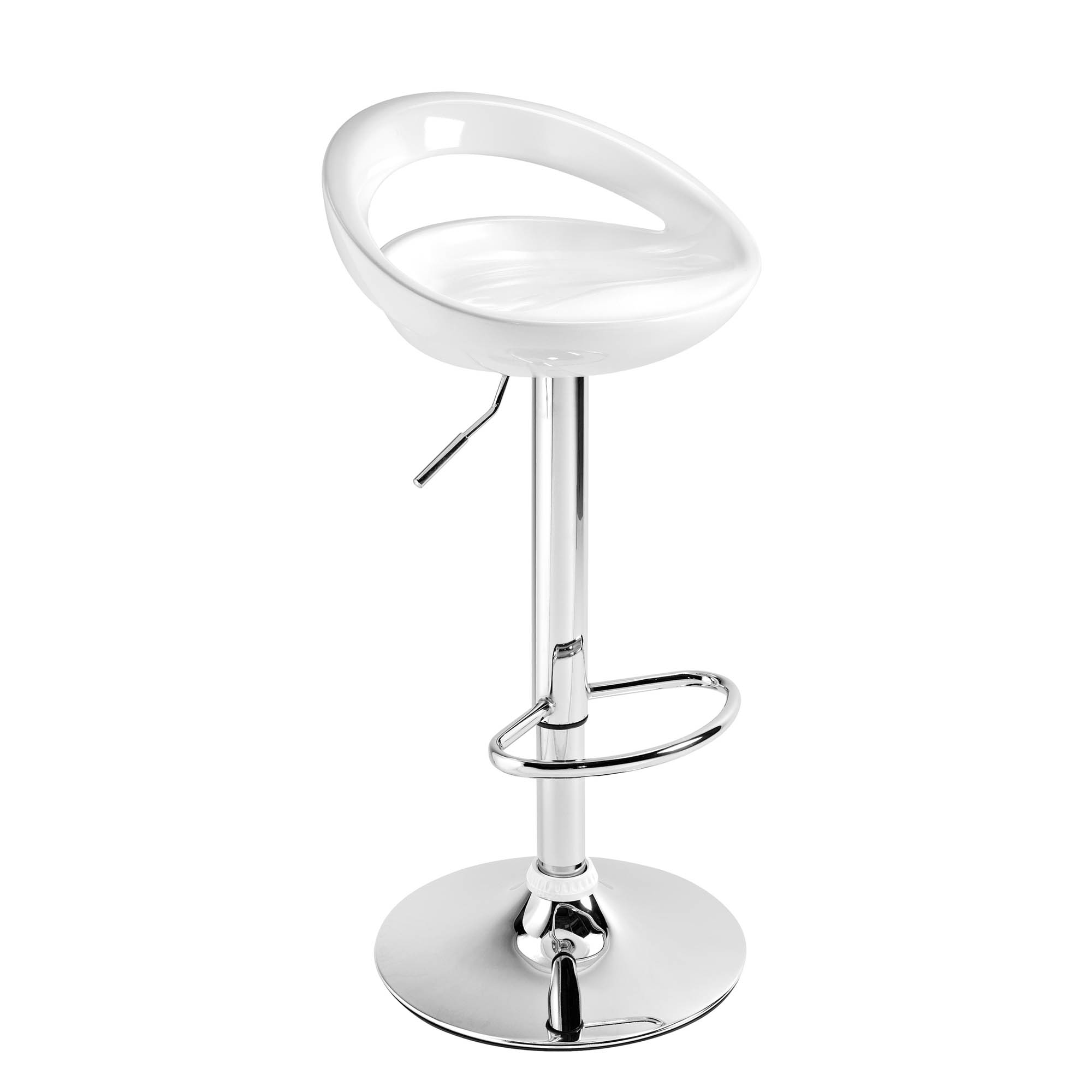 Questo sgabello è regolabile in altezza da 60 a 81 cm ed è dotato anche di una barra poggiapiedi semicircolare in metallo cromato.