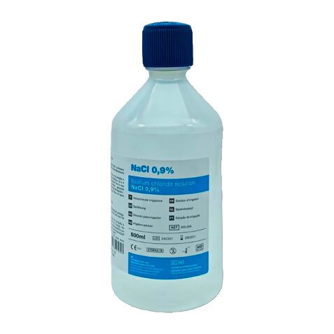 Flacone monouso di soluzione salina sterile al 0,9% cloruro di sodio per il lavaggio di ferite, piaghe, abrasioni, ustioni e per irrigazione meccanica degli occhi.