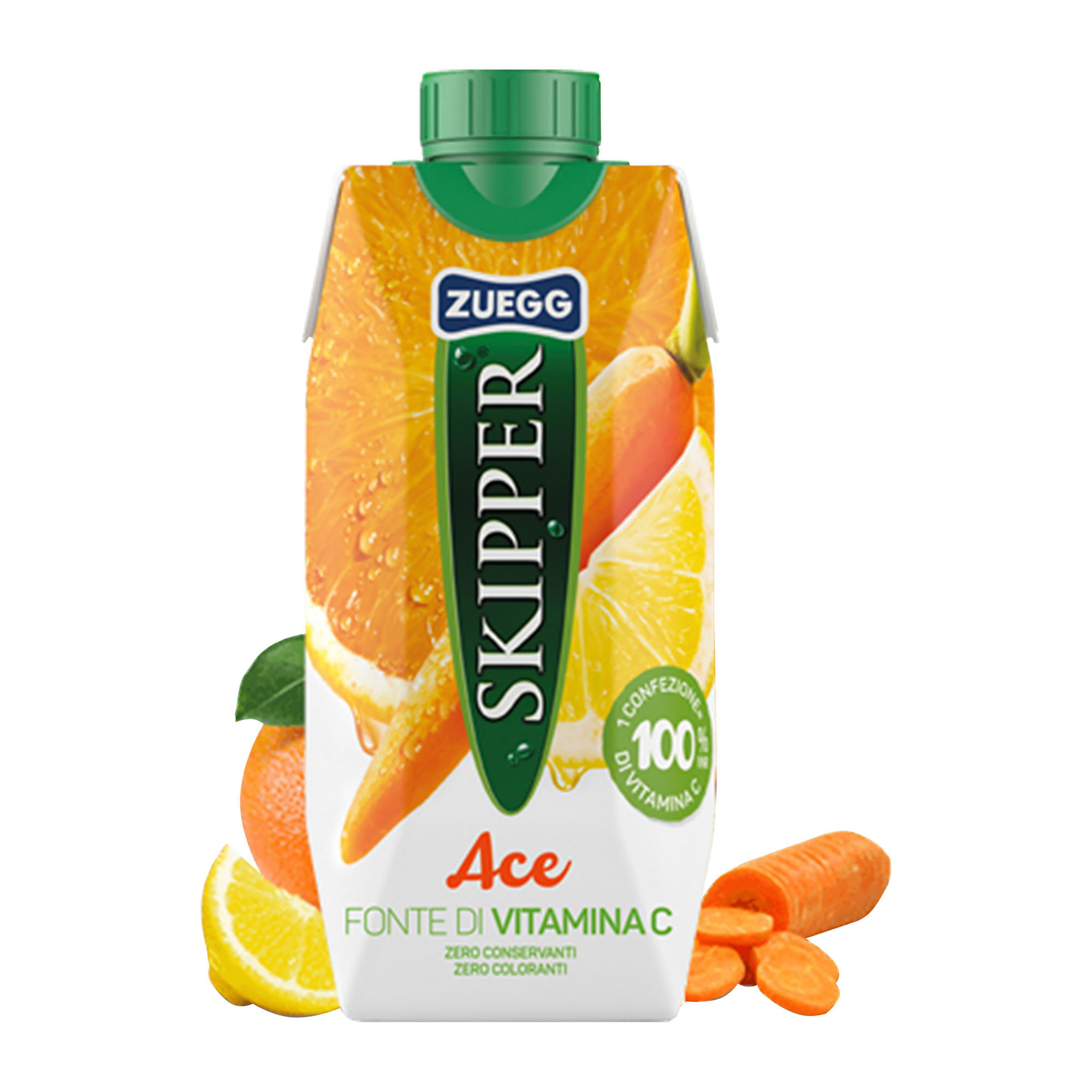 Succo Skipper gusto ACE BRICK 330ml Zuegg. Bevanda analcolica a base di succo di arancia, succo di carota, succo di limone, con vitamina C, vitamina E, vitamina A. Ingredienti: acqua, succo di arancia (21%), zucchero, succo di carota (5%), succo di limone (4%), aroma naturale, vitamina C, vitamina E, vitamina A. SENZA GLUTINE.