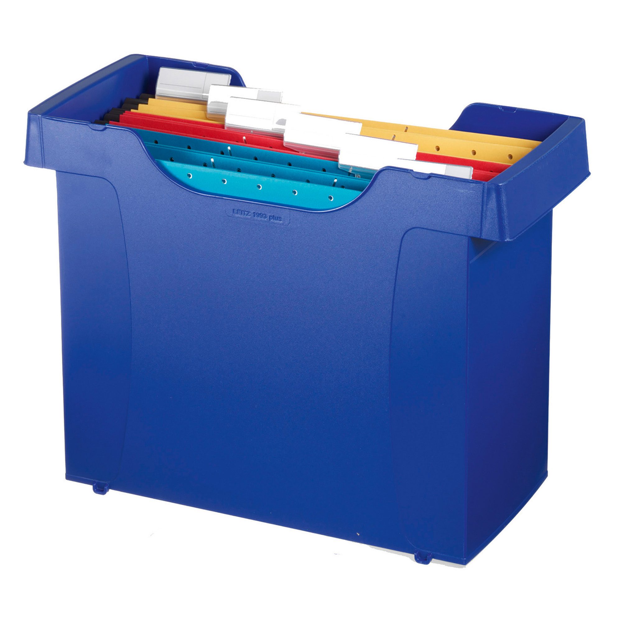 Archivio portatile per cartelle sospese interasse 33 cm realizzato in robusto polistirene 100% riciclabile, con maniglie integrate per una presa sicura in caso di trasporto.